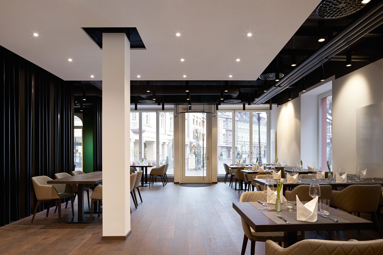Das Restaurant öffnet sich heute mit großzügigen Fenstertüren zum Markplatz. Dort liegende Nebenräume wurden entfernt, der Gästebereich dadurch maximal vergrößert. Ebenso wurde der Blickkontakt zur „Alb“ ermöglicht, sodass der Gastraum heute komplett durchbindet.