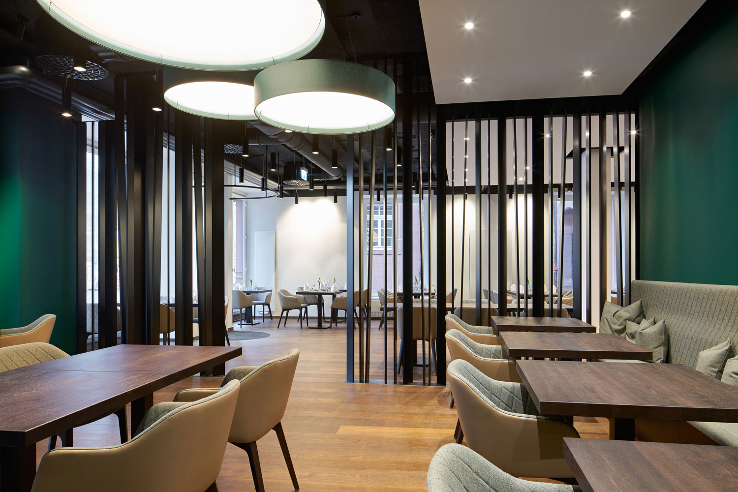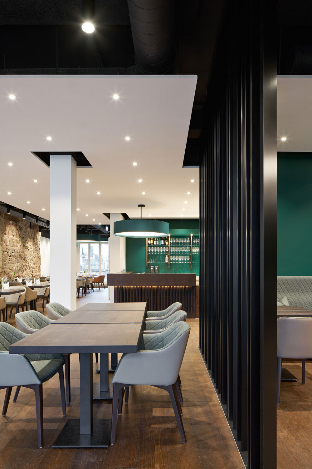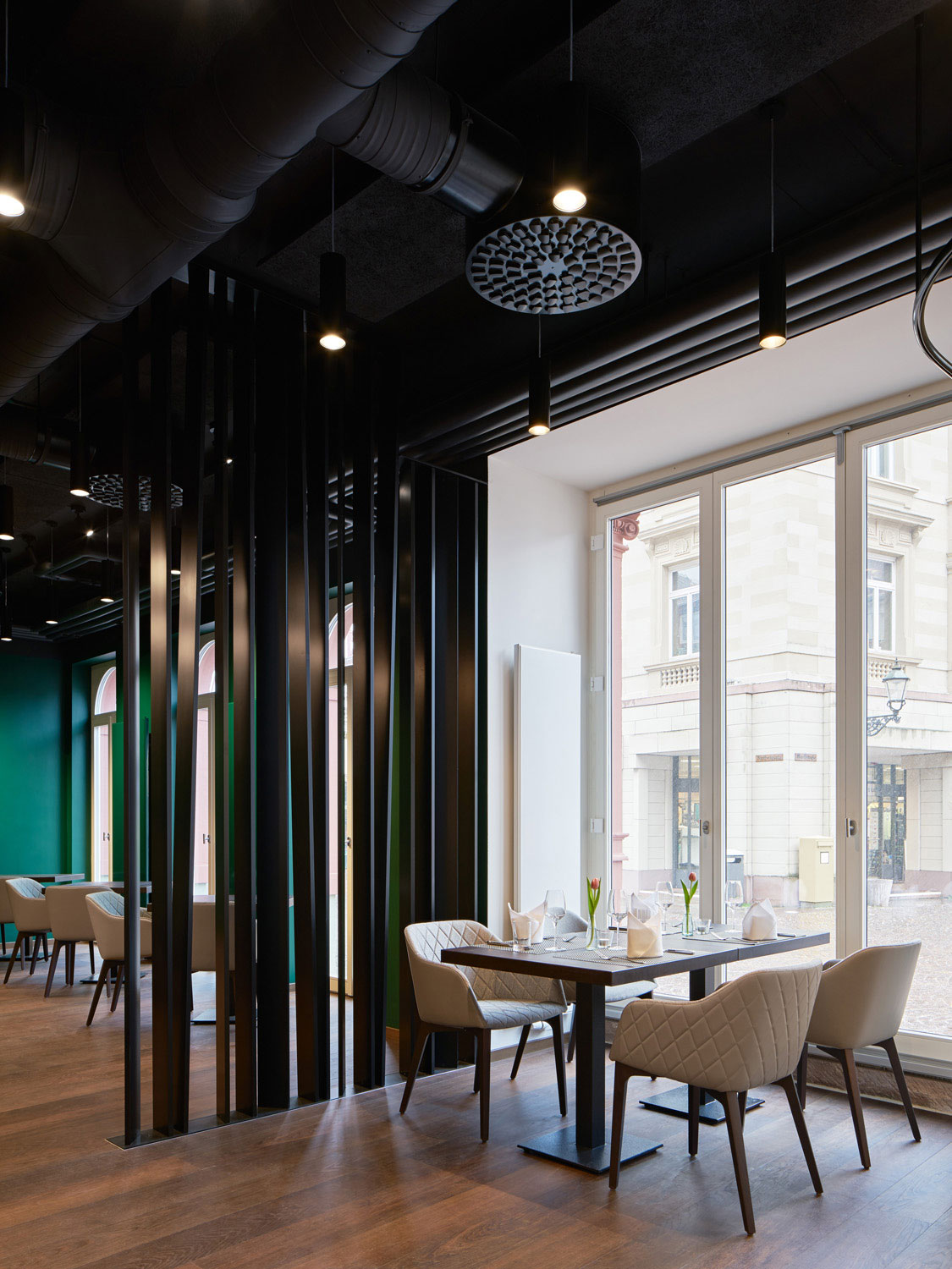 Um dem Gastronomen verschiedene Raummodelle anbieten zu können, entstand das durch einen Paravent separierte grüne Kaminzimmer, das sich vom großen Gastraum atmosphärisch unterscheidet. Insgesamt verfügen die „Ratsstuben“ nun über ein differenziertes Raumangebot, sodass vom Einzelgast, der größeren Gruppe bis zur geschlossenen Gesellschaft eine vielfältige Nutzung für den Betreiber möglich ist.