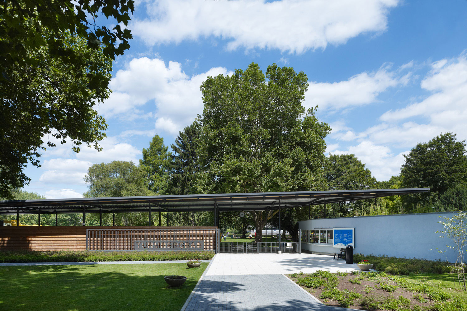 Ein durchgängiger Plattenbelag verbindet die Hochbauten mit dem Gastro-Container und der Milchbar. Auf dieser Terrasse kann sich die Gastronomie ausdehnen. Zum Teil überdeckt das Stahldach diese Fläche und funktioniert sowohl als Sonnenschutz als auch als Unterstand bei Platzregen.