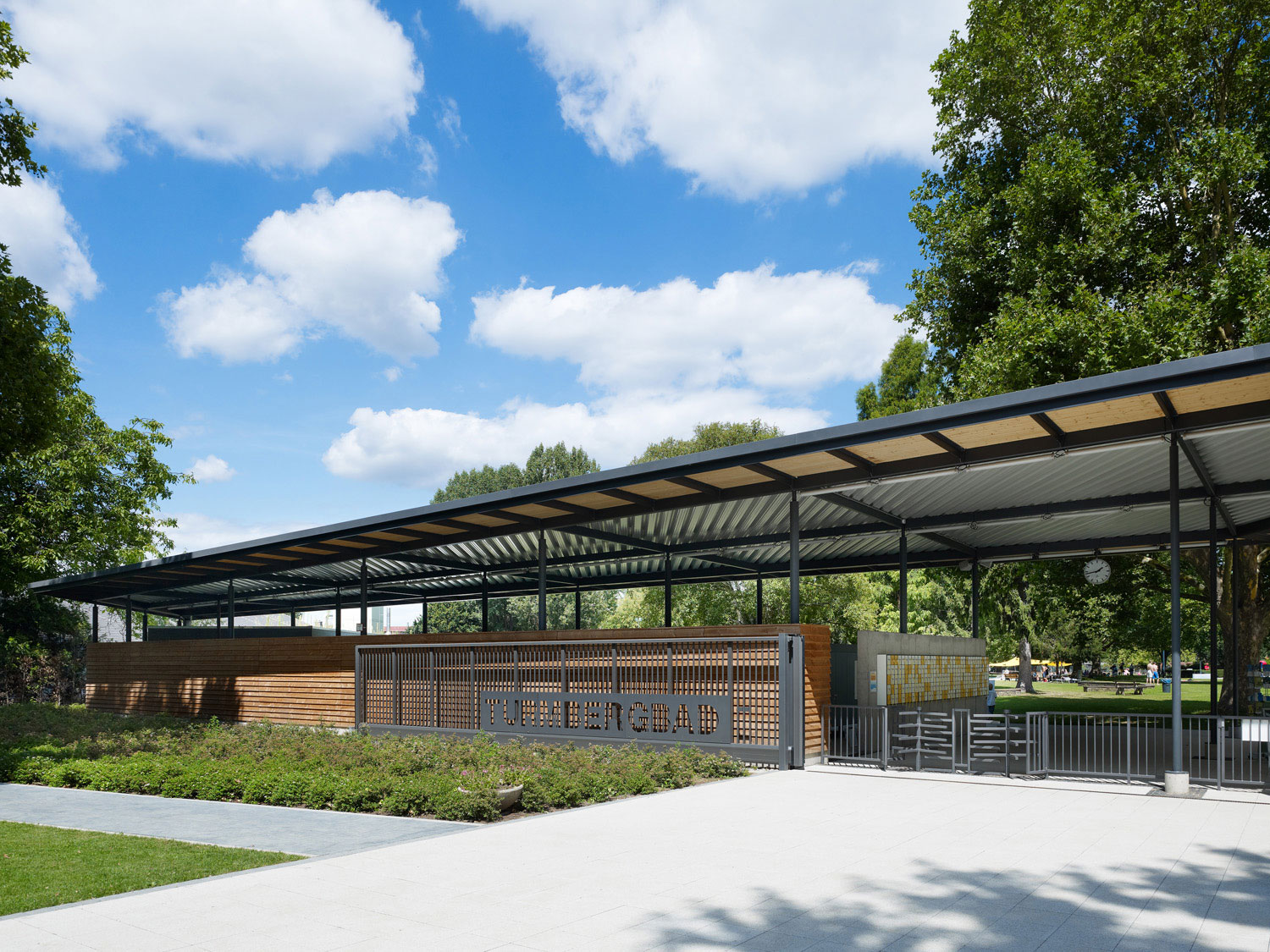 Die Hinführung zum Eingang wird durch zwei massive Schenkel, die mit leichtem Stahl-/Trapezblech verkleidet sind, klar markiert. Die Umkleiden befinden sich unter dem schwebenden Dach. In die massiven Schenkel kommen die nötigen Sanitärräume und die Kasse mit ihren Verwaltungsräumen unter.