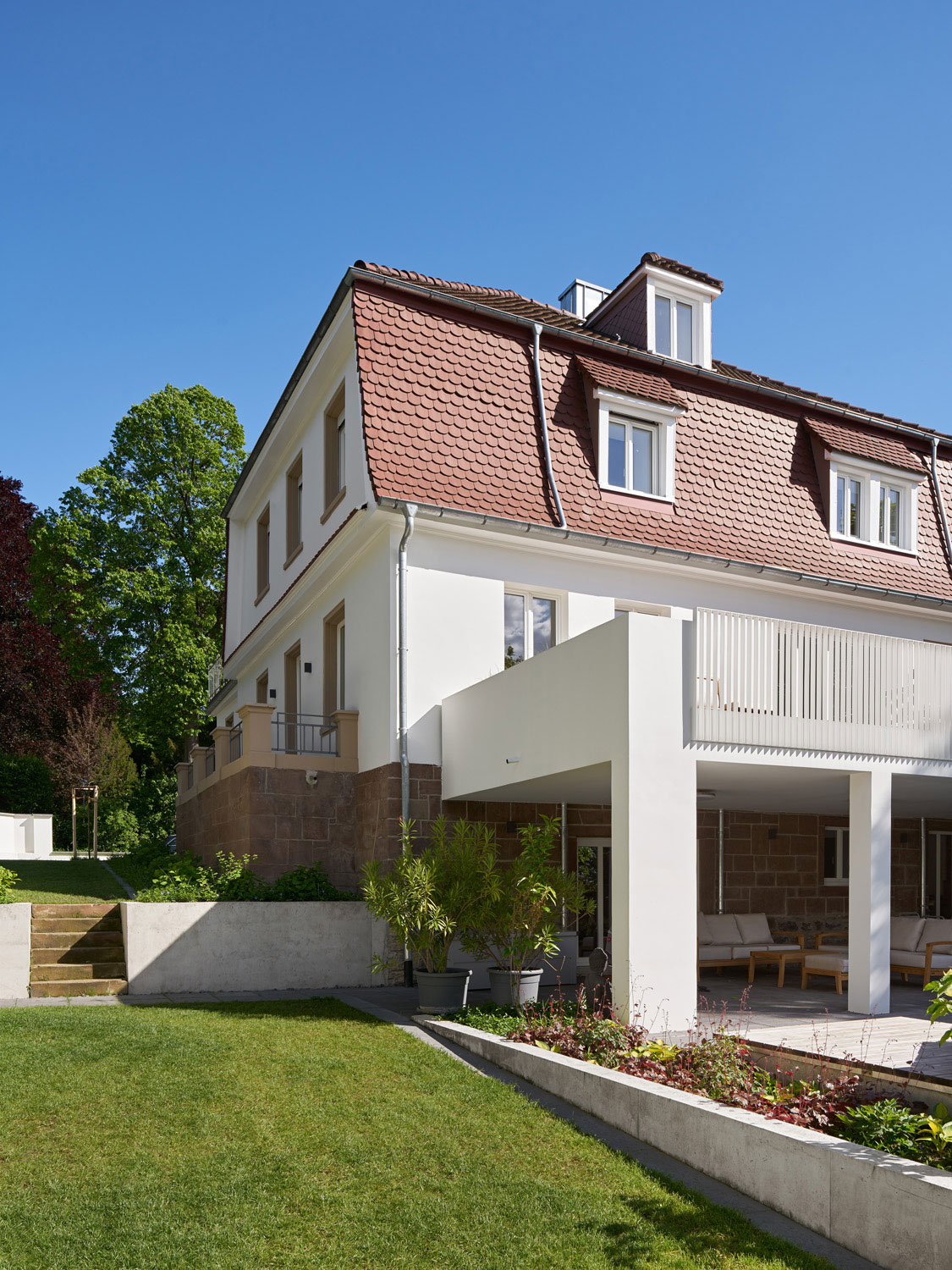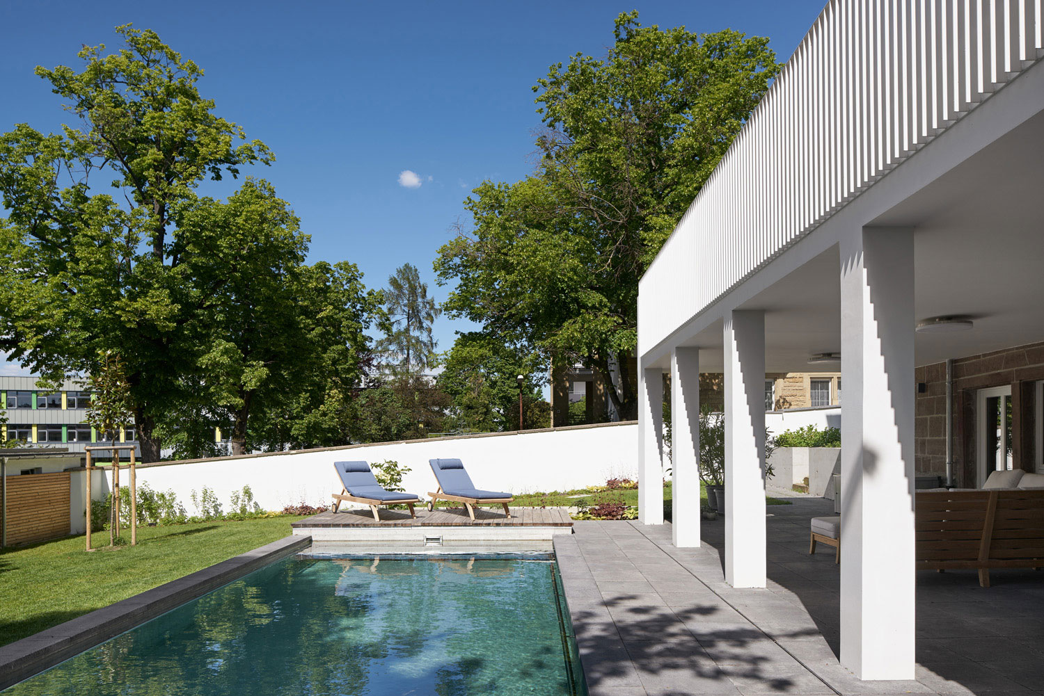 Die größten Eingriffe fanden in den Außenanlagen statt. So wurde eine Terrassenkonstruktion auf der talseitigen Gartenseite realisiert, die dem im Erdgeschoss liegenden Koch-Essbereich vorgelagert wurde. Der darunter liegende, überdachte Außenbereich dient als sonnengeschützte Terrasse auf Pool- also Gartenebene.
