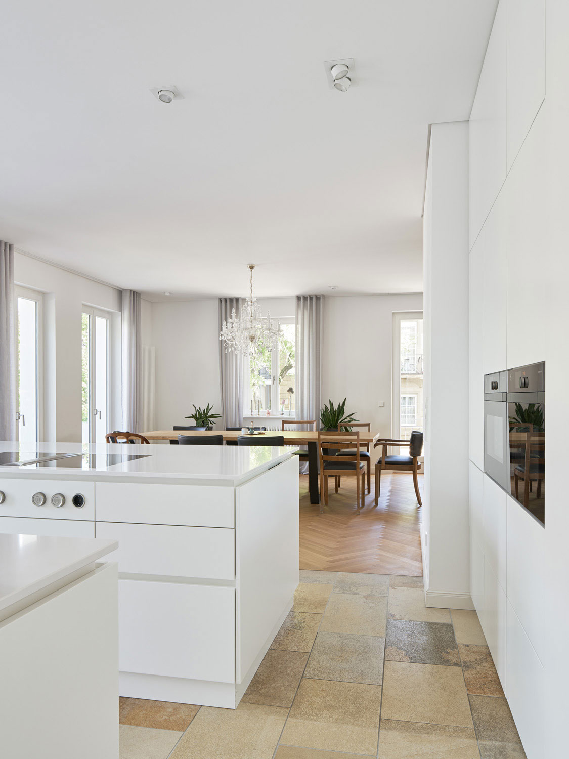 Im Erdgeschoss fanden wir im Eingangsbereich einen alten Natursteinbelag aus Solnhofer Kalkstein vor, den wir nur lokal ausbessern mussten. Das alte Material ist zum Glück auch heute noch erhältlich gewesen.