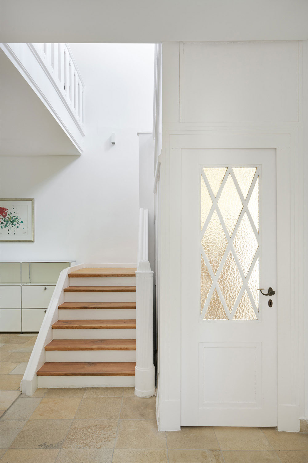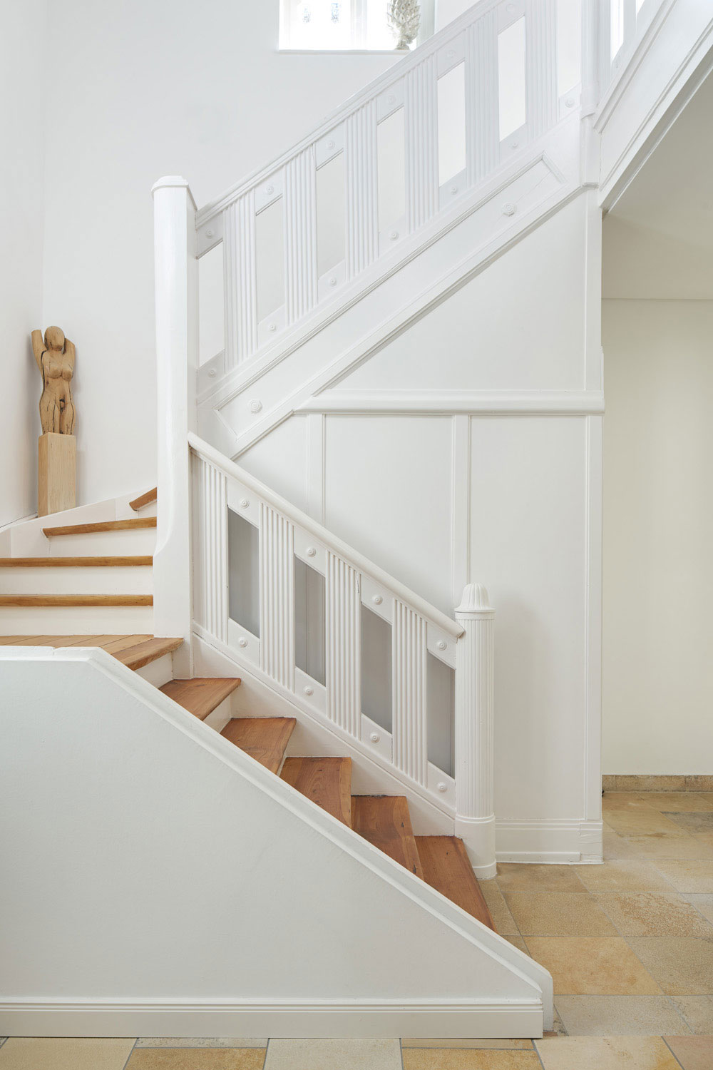 Die dunkle, alte Holztreppe haben wir frei gestellt, indem wir einfassende Holzverkleidungen entfernt haben. Durch die weiße Lackierung kommt die feine, ursprüngliche Holzbearbeitung zur Geltung. Die Treppe steht wie ein Kunstobjekt - gebaute Handwerkskunst - .im Raum.