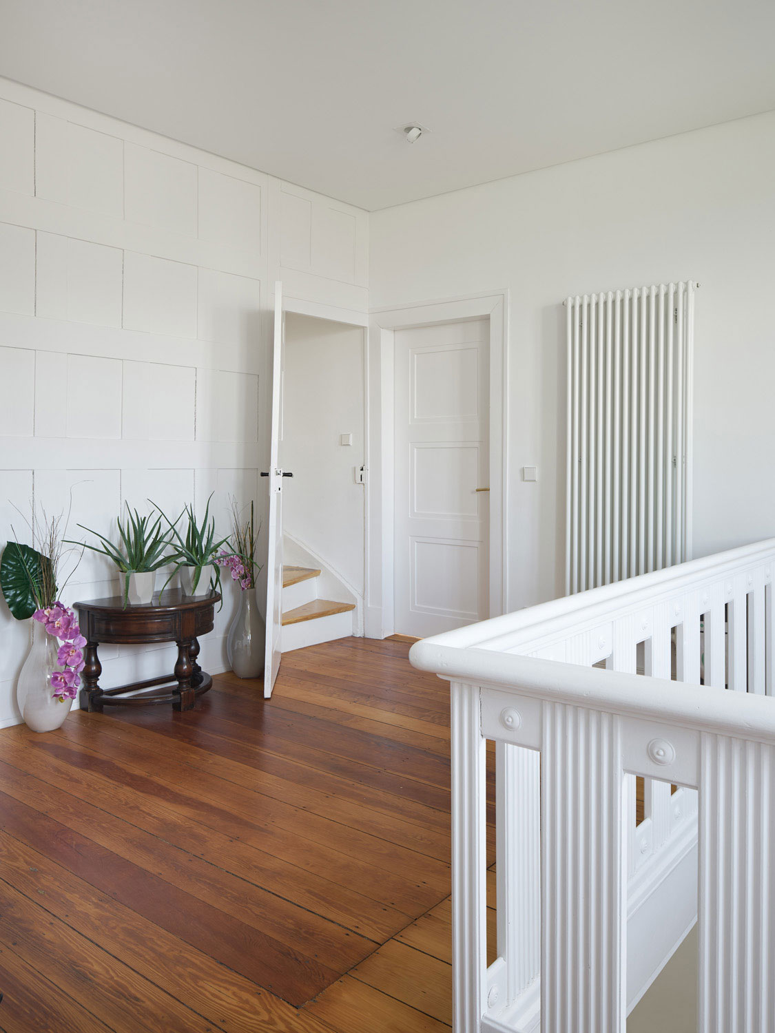 Im Obergeschoss konnten wir die alten Pichpine-Holzdielen sichern und aufarbeiten lassen. Türen und Holzwerk wurde erhalten, neue Türen als stumpf einschlagende Türblätter mit Blockzargen neu und erkennbar hinzugefügt.