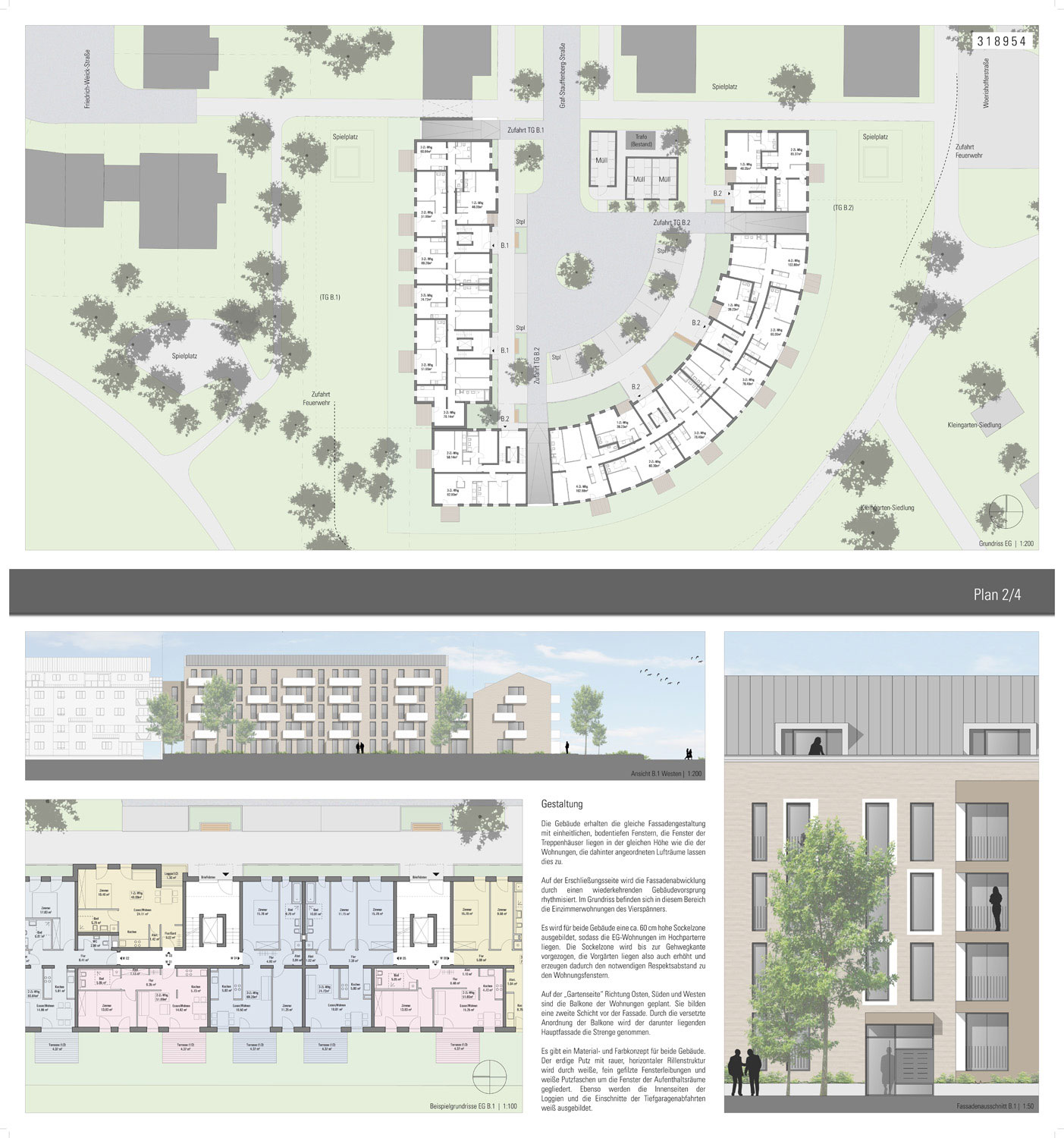Der Bauabschnitt B1 ist die Verlängerung des bestehenden, viergeschossigen Gebäuderiegels, der Bauabschnitt B2 schließt den öffentlichen Raum mit einem bogenförmigen, dreigeschossigen Gebäude ab.