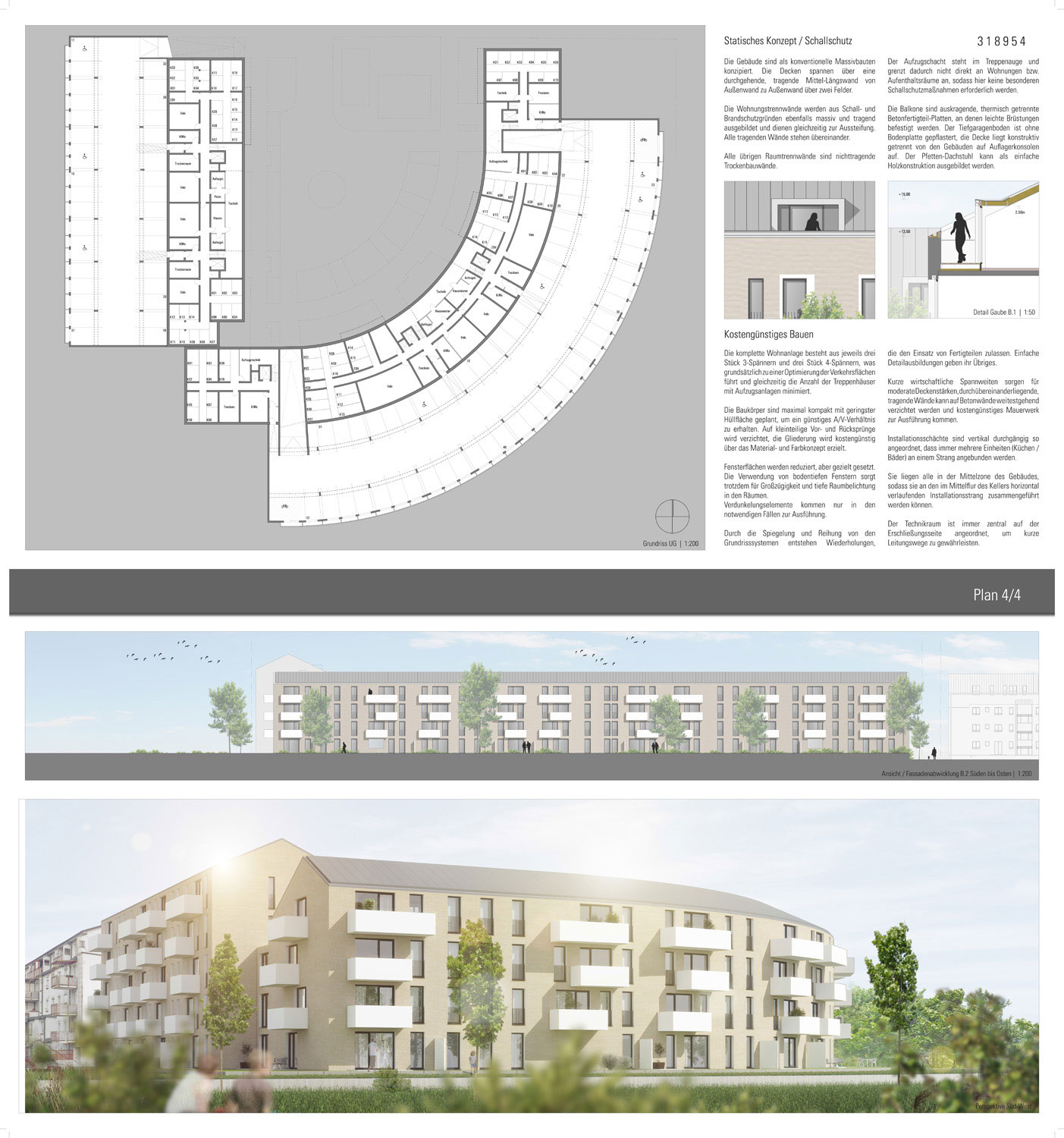 Durch die Spiegelung und Reihung von den Grundrisssystemen entstehen Wiederholungen, die den Einsatz von Fertigteilen zulassen. Einfache Detailausbildungen geben ihr Übriges.