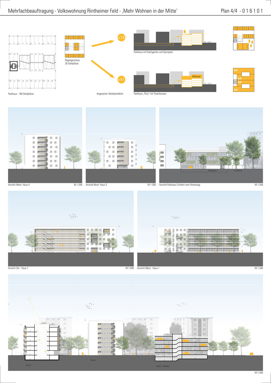 Da im Planungsgebiet die Zielgruppe ältere Menschen und Studenten sind, wäre der Stellplatzschlüssel 1 STP. / WE zu hinterfragen. Wenn es möglich wäre, infolge der vielen geforderten Kleinwohnungen, der hervorragenden Nahverkehrsanbindung, der Erhöhung der Fahrradstellplätze und der Einbindung der Stadtmobilflotte, den Stellplatzschlüssel auf 0,5 - 0,7 STP. / WE zu verringern, könnte das Parkhaus um ca. 1,5 Geschosse niederer werden.