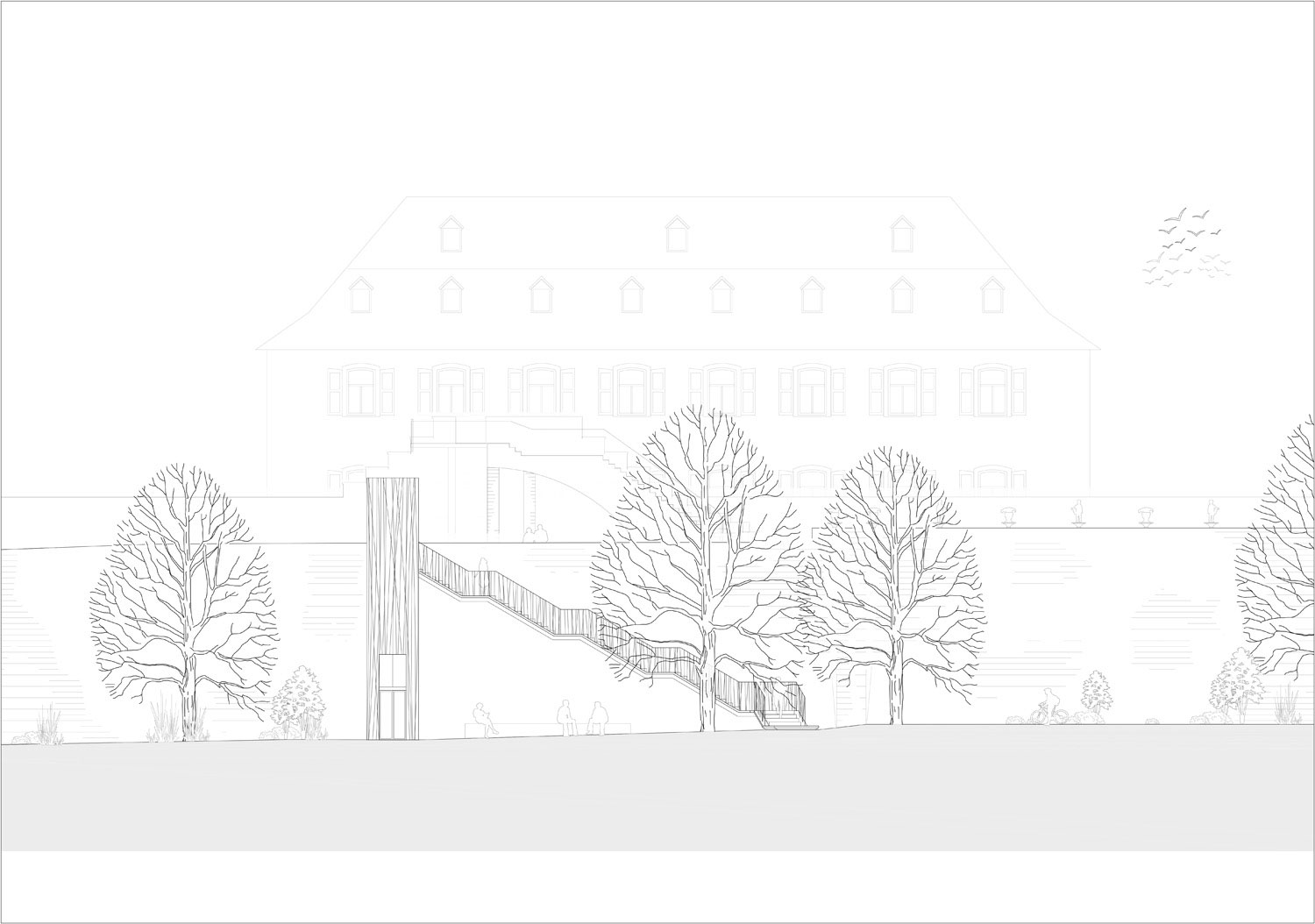 Von beiden Ufern des Mühlbachs aus erkennt man schon von weitem den transparenten Aufzugsturm mit der langgestreckten Kaskadentreppe als prägnante Landmarke, welche von der Stadtmauer abgesetzt ist. Der Antritt der Treppe ist direkt gegenüber der neuen Fußgängerbrücke bei der Villa Bauer positioniert und schließt an die vorhandene Wegeführung an. Die komfortable Treppe wird entlang der Stadtmauer zum Barockgarten geführt und setzt das baukulturelle Erbe in Szene, ohne es zu dominieren. Der Aufzugsturm steht gemeinsam mit dem Treppenantritt auf einem kleinen Vorplatz, der mit Bänken zum Verweilen einlädt und als Treffpunkt dienen kann. Oben kommen Treppe und Aufzug zusammen und werden als Steg weiter in die Kittelgasse geführt.
