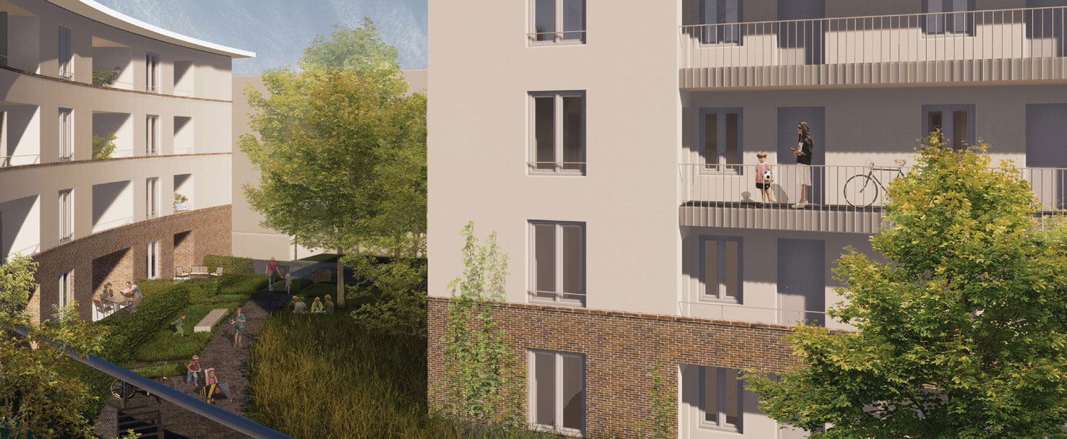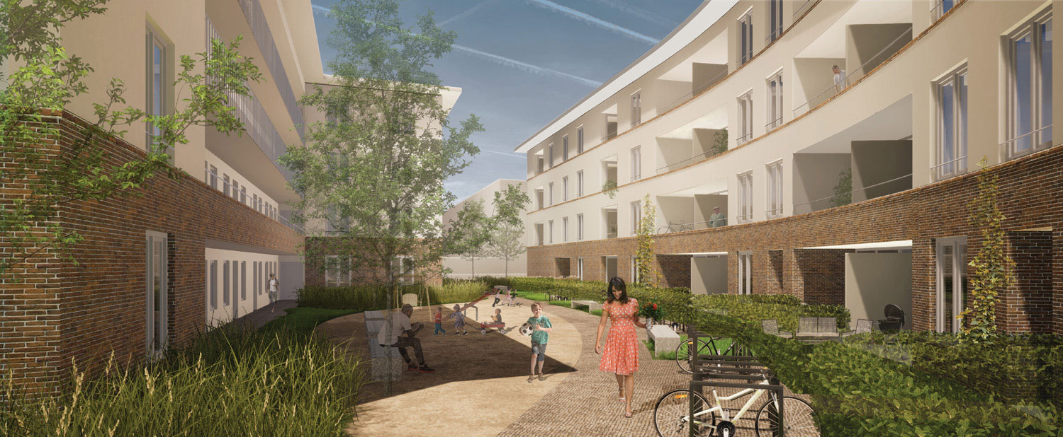 Die im Innenblock liegenden Außenanlagen werden direkt von den Gebäuden, als auch von den Gehwegen erreicht. Die Fläche liegt um ca. 50 cm gegenüber den Gehwegen erhöht, was die Privatheit unterstreicht, jedoch von Häusern ebenerdig, um diese hindernisfrei zu erreichen. Die Wohneinheiten im Baukörper 1 ( Bogen ) erhalten kleine, zugeordnete Terrassenflächen, die durch niedere Hecken eingefasst werden. An den hofseitigen Hauseingängen sind Fahrradstellplätze für Besucher angeordnet. Bänke entlang des Weges laden zum Verweilen ein. An zentraler Stelle weitet sich der Weg zu einer Kleinkinderspielfläche. Die großkronigen Bäume mit Erdverbund sorgen für Schatten und schaffen eine angenehme Distanz zwischen den kompakt stehenden Baukörpern. Der Innenhof ist mit unterschiedlich hohen Gräsern, blühenden Stauden, bis zu begehbaren Rasenflächen unterschiedlich bewachsen und bietet Bienen einen Lebensraum inmitten der Stadt. Die blühenden, wohlduftenden Laubbäume machen die Jahreszeiten erlebbar und sorgen für Vogelgezwitscher.