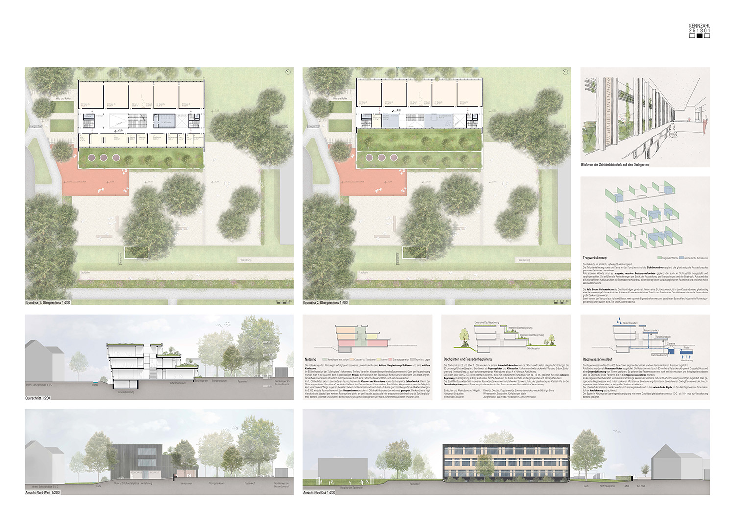 Gebäudekonzept Das Gebäude ist von den abgestaffelten Geschossen mit den üppigen Dachgärten und Begrünungen geprägt. Die von allen Geschossen voll erlebbaren Dachgärten schaffen eine beruhigende, erholsame Atmosphäre für Schüler und Lehrer. Sie dienen der Verschattung, bilden einen Klimapuffer, schützen vor Überhitzung, kühlen und speichern zusätzlich das Regenwasser. Sie sind jedoch nicht als begehbare Flächen für Schüler und Lehrer gedacht. Der Bewuchs ist so gewählt, dass die Unterhaltung der Dachgärten mit geringem, zeitlichem Aufwand abbildbar ist.