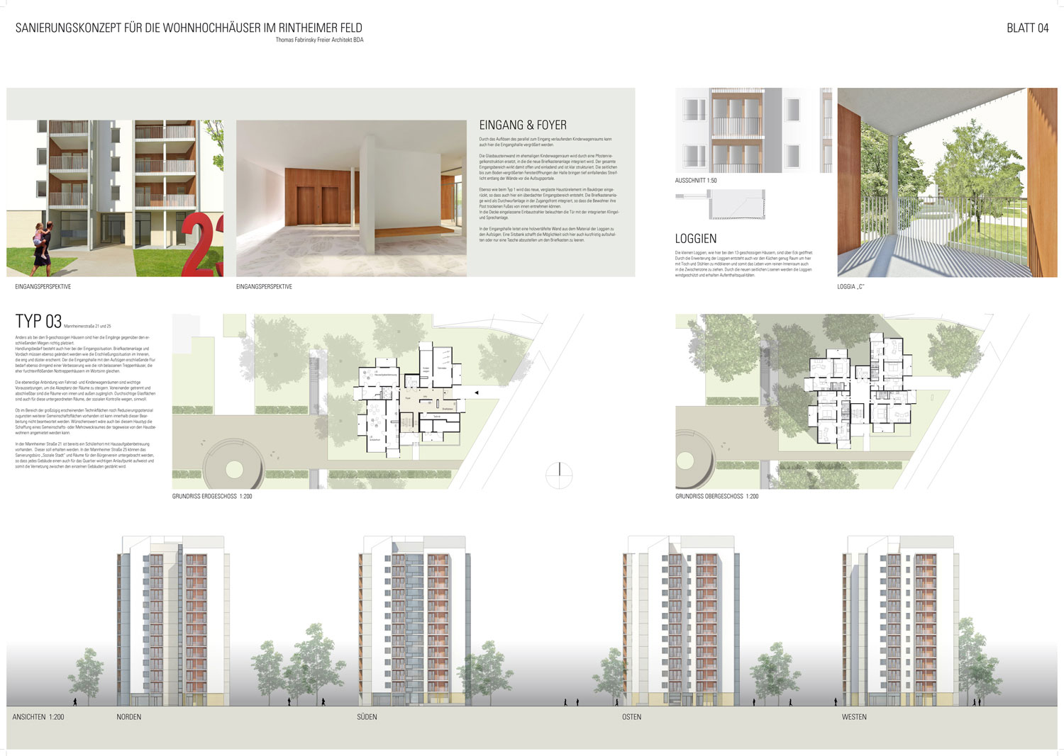 Die Loggien sind die wichtigsten Gliederungselemente der sonst einfachen und schmucklosen Fassaden. Im Bestand wirken sie unruhig und zergliedert. Mit der Neugestaltung der Fassade sollen die Bauteile und damit die nutzbare Fläche vergrößert und durch hochwertige Details aufgewertet werden.