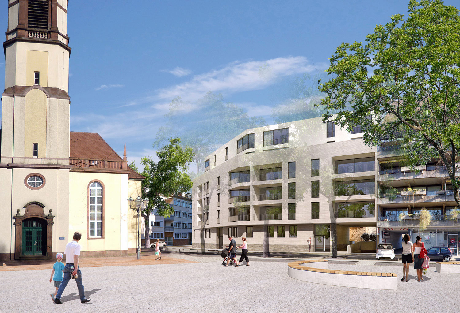 Wir nützen die privilegierte Lage mit Aussicht auf die Karl-Friedrich-Gedächtniskirche und den vorgelagerten Lindenplatz und richten die Hauptwohnung nach Westen aus.