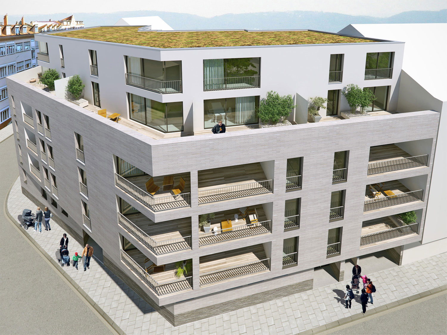 Jede Wohnung hat mindestens einen tiefen Freisitz, auf dem ein der Anzahl der Bewohner angemessener Tisch Platz findet.