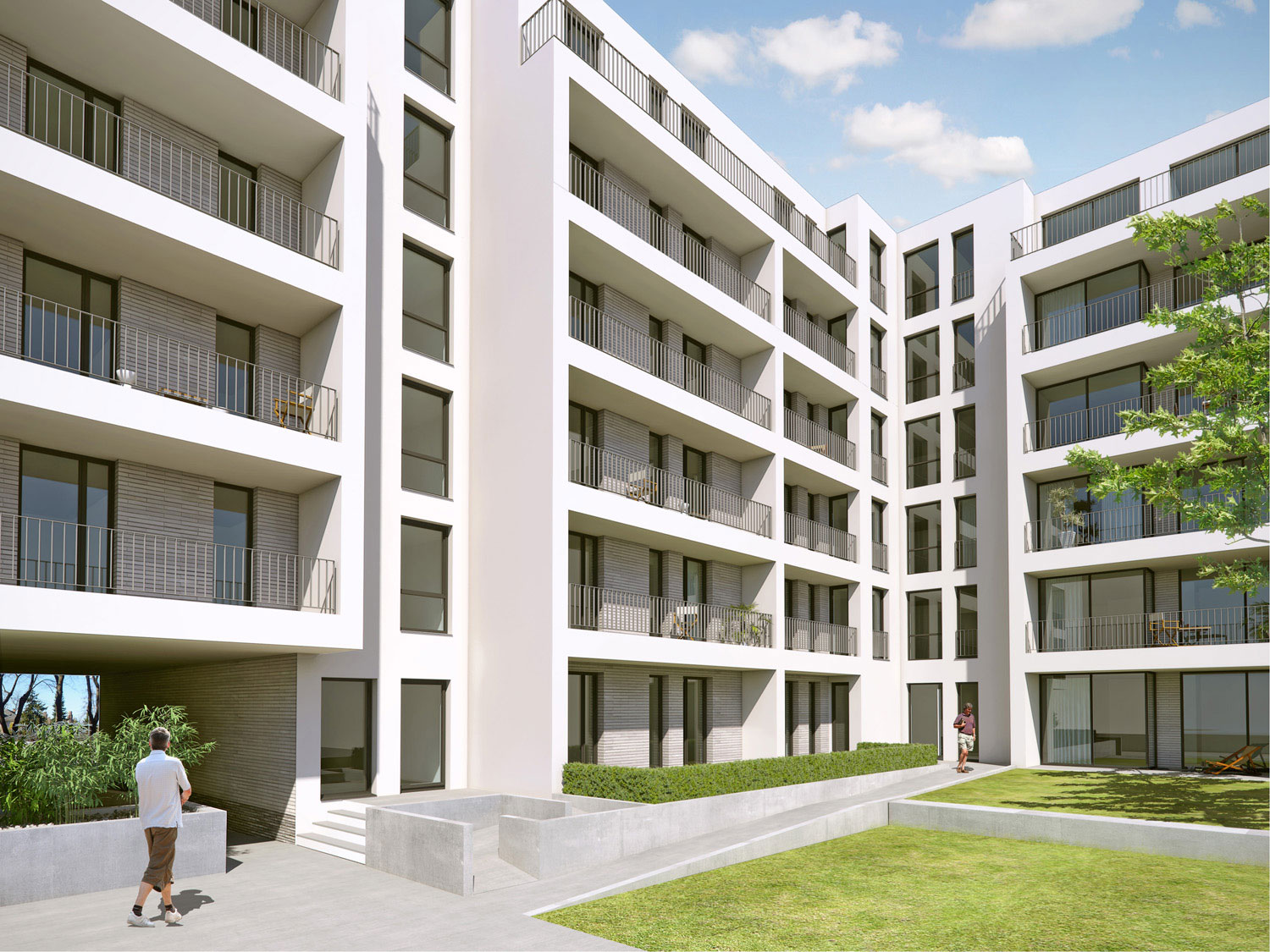Alle Loggiaeinschnitte sind weiß verputzt, um möglichst viel Sonnenlicht in die Räume zu reflektieren, bei der Hinterhoffassade ist das Materialkonzept umgekehrt. Der Baukörper ist komplett weiß mit einem WDVS-System verputzt. Nur die Loggiarückwände sind mit den Verblendern verkleidet und speichern die warme Südsonne.