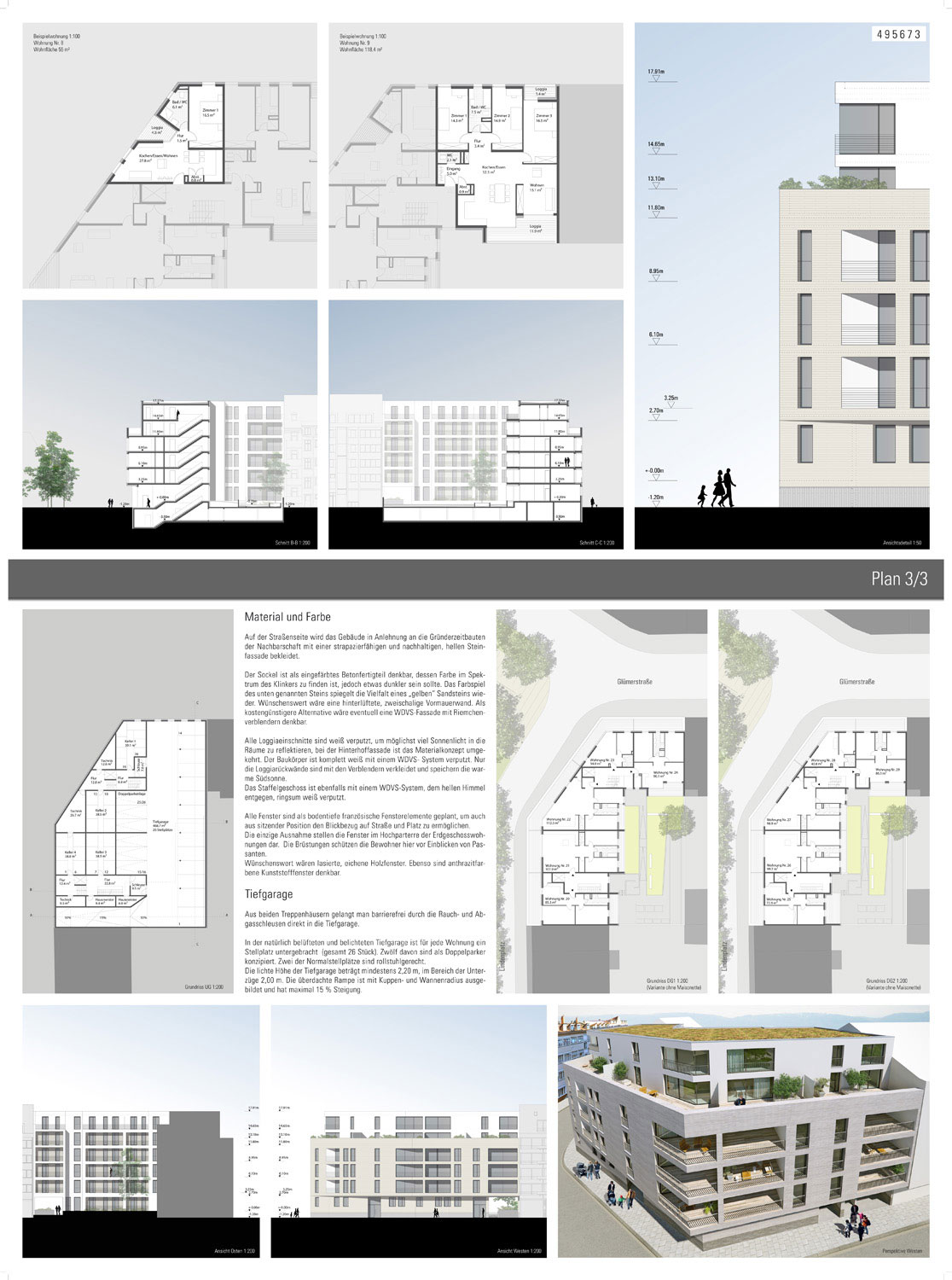 Im Staffelschoss bieten sich zwei Lösungen an, die wir als Alternativen dargestellt haben. Die erste Variante bietet auch im Staffelgeschoss gestapelte Einzelwohnungen. Damit ergeben sich insgesamt 29 Wohneinheiten.
