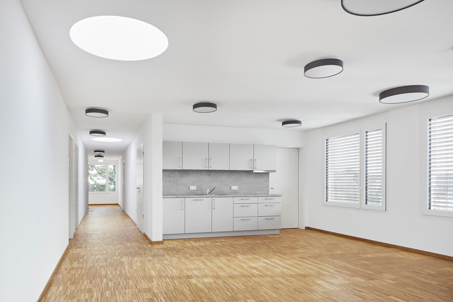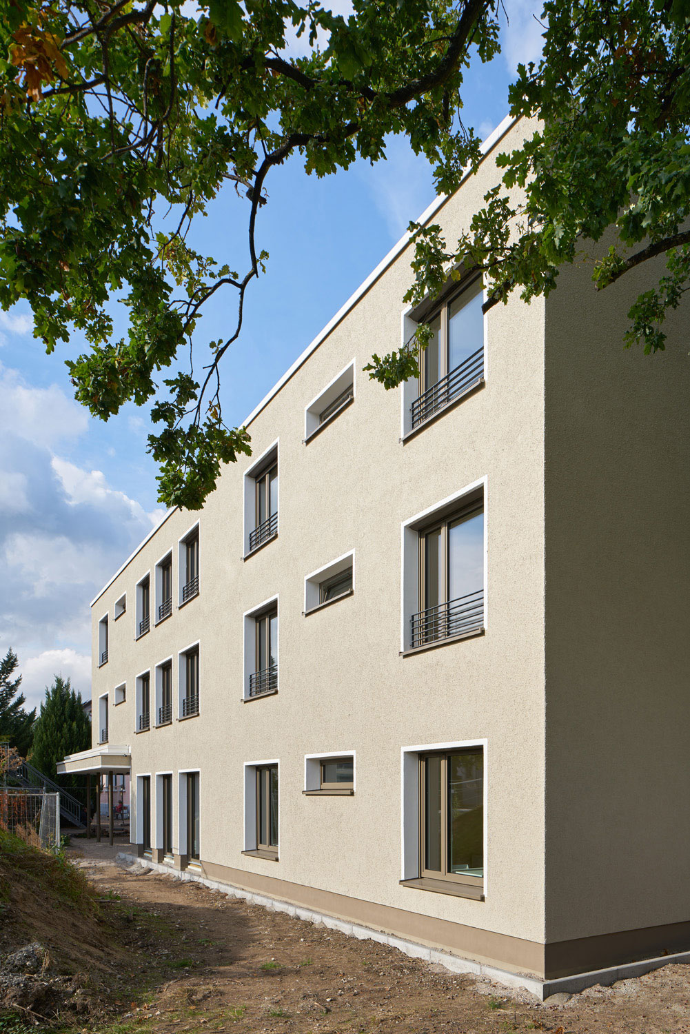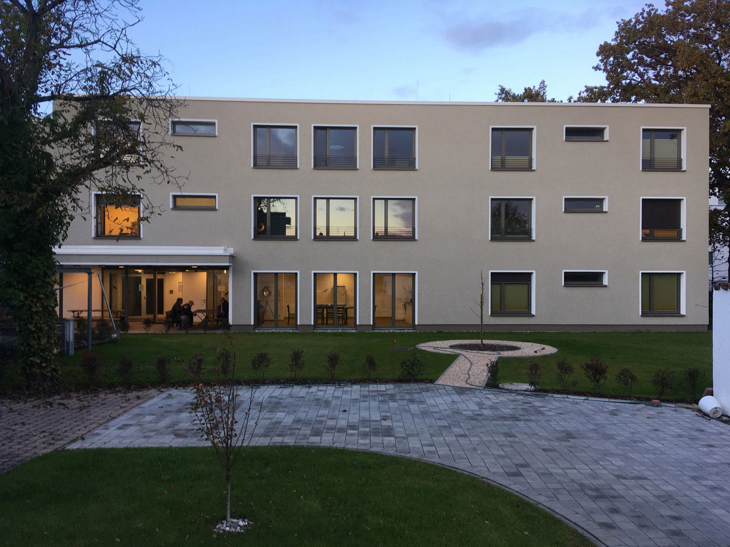 Wir haben hierfür ein dreigeschossiges Wohnheim mit 3 Wohngruppen mit jeweils 8 Ein- und Zweizimmer-Einheiten mit großzügigen Gemeinschaftsflächen auf dem bestehenden Standort, in zweiter Reihe, entworfen, geplant und gebaut. Jedes der 24 Bewohnerzimmer verfügt über ein Ensuite-Bad und eine hotelähnliche Ausstattung. Die Fenster sind mit einer niederen Brüstung errichtet, um den Bezug in den parkähnlichen Garten auch aus sitzender oder liegender Position zu ermöglichen. Selbstverständlich ist die gesamte Anlage barrierefrei ausgestattet.