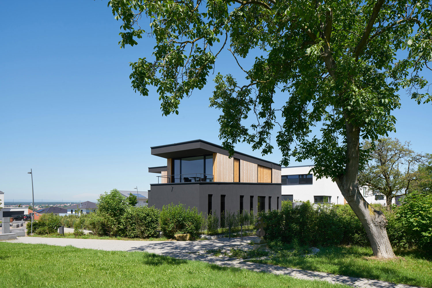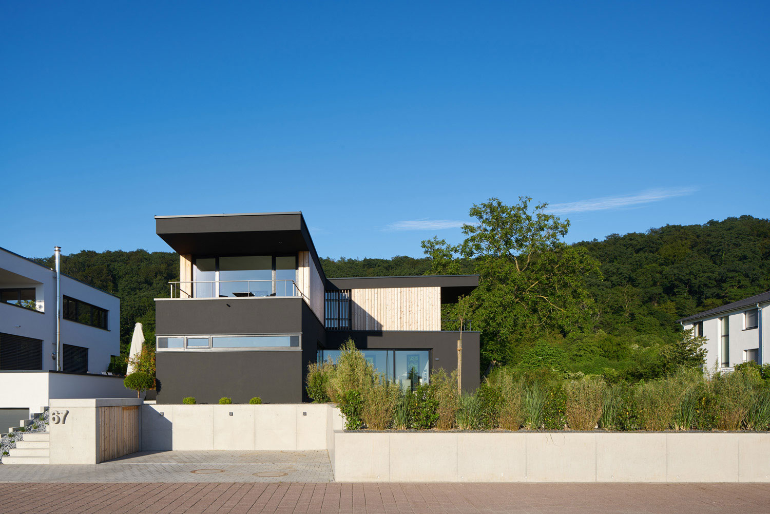 Haus HF steht am oberen Rand eines Neubaugebietes, an einem in die Rheinebene abfallenden Hang. In direkter Nachbarschaft sind schon einige Bauplätze mit ambitionierten weißen „Bauhauskuben" bebaut.