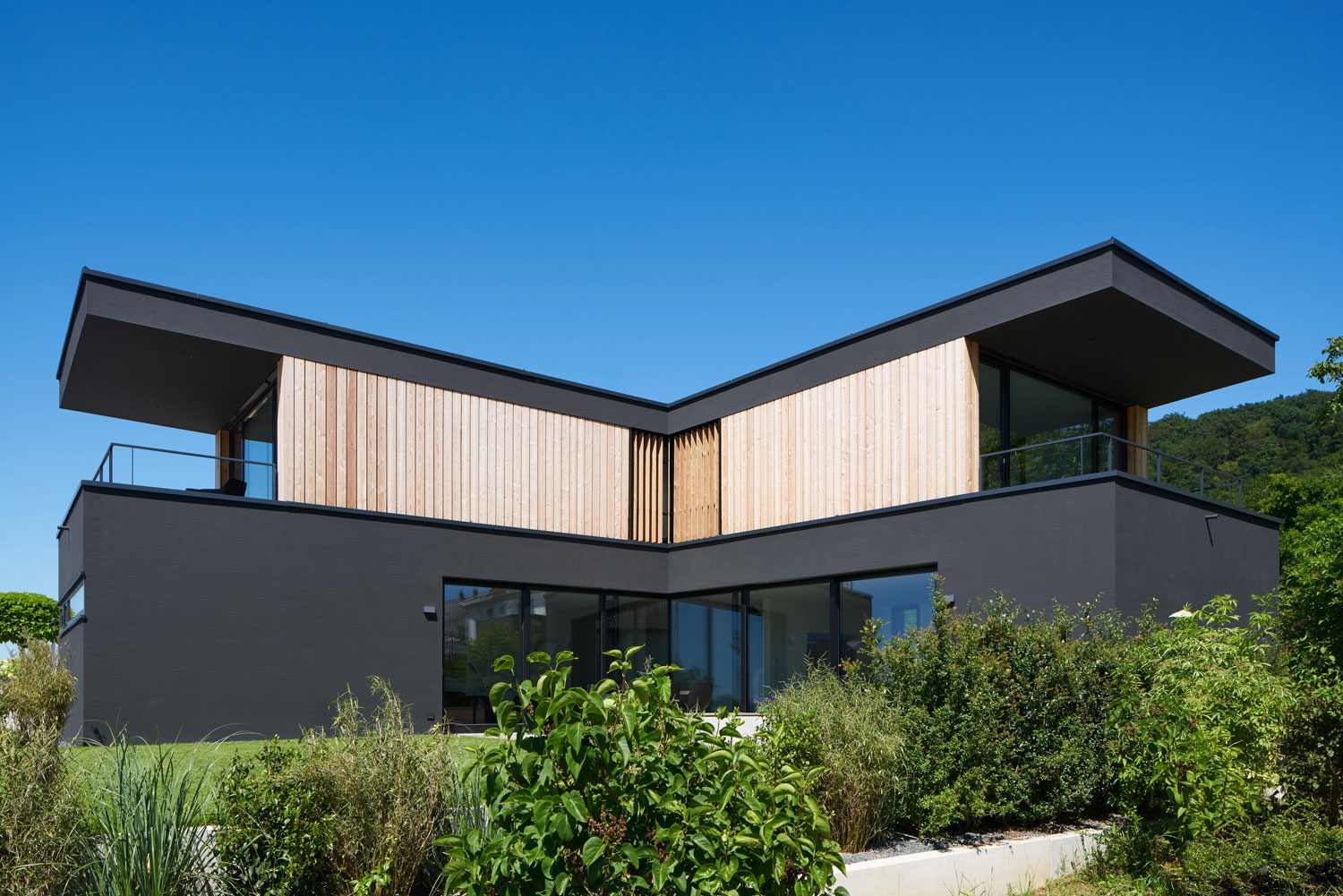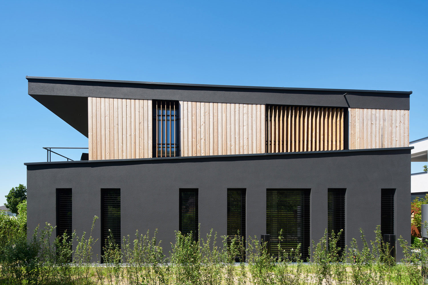 Der scharf geschnittene Baukörper öffnet sich nach Süd-Westen Richtung Rheinebene. Die schmalen Gebäudeschenkel minimieren im Zusammenspiel mit dem horizontal geschichteten Volumen die Gebäudemasse. Die umlaufende Holzschalung aus sägerauer, unbehandelter Lärche wird im Fensterbereich zu stehenden Lamellen, um den Ausblick zu gewährleisten, ohne das Holzband zu unterbrechen. Auf den zurückgenommenen Loggien eröffnet sich der wunderbare Blick in die Ebene bzw. in den angrenzenden Wald.