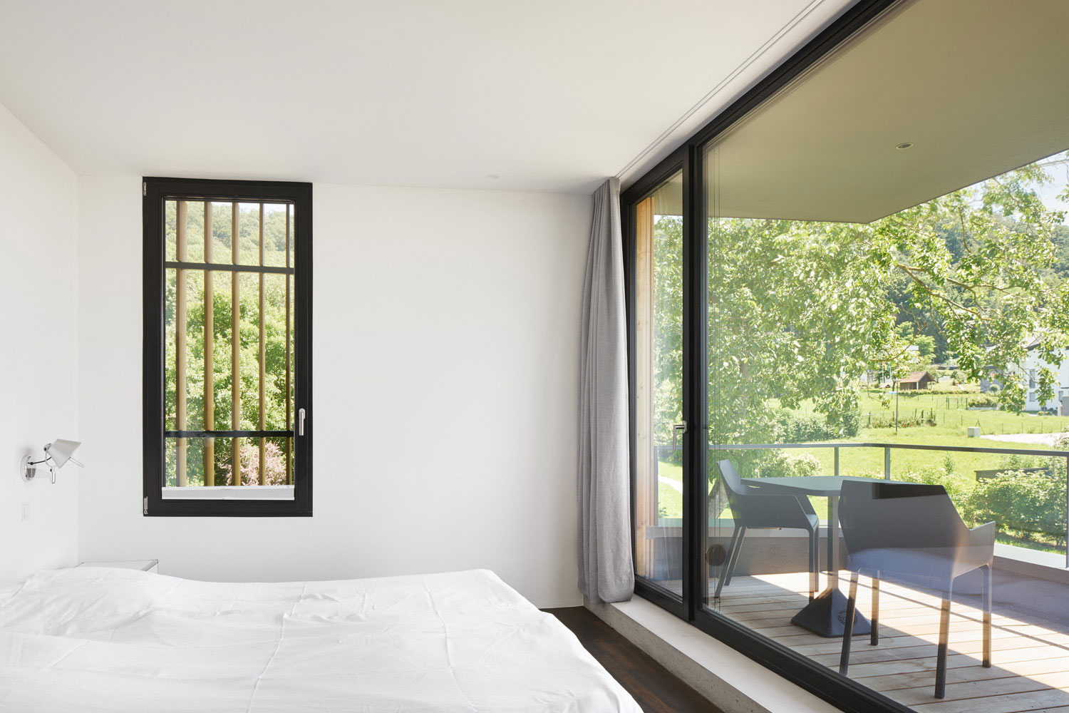 Im Innern sind die Räume von erfrischender Klarheit geprägt. Von jedem Standort eröffnen sich Durch- und Ausblicke, Sonnenlicht ist allgegenwärtig. Die Materialien nehmen sich freundlich zurück, ein dunkler Holzboden zieht alle Räume zu einem Großen zusammen. Perfekt ausgeführte Sichtbeton-Bauteile wirken vor den sonstigen weißen und schwarzen Putzflächen wie edle Natursteinwände. Die nicht sichtbar befestigten Treppenstufen zwischen den weißen Wänden vermitteln größtmögliche Transparenz. Stoffe als Sicht- und Verdunkelungsschutz in den Schlafräumen unterstützen diese Leichtigkeit.