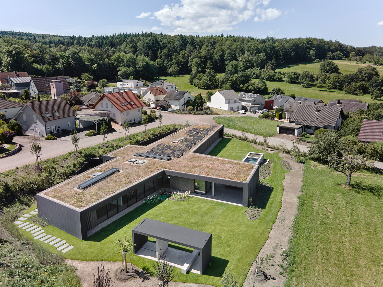 Das Grundstück hat ein Nord-Süd-Gefälle, d. h. die zum Grundstück führende Anliegerstraße liegt oberhalb des Gebäudes und führt bergab zur Grundstückseinfahrt. Dadurch ist die „fünfte Ansicht“, die Dachaufsicht voll einsehbar. Die Dachfläche mit flach darüber aufgeständerter PV-Anlage ist ganzflächig begrünt, im Frühjahr blüht hier eine rote Mohnwiese.