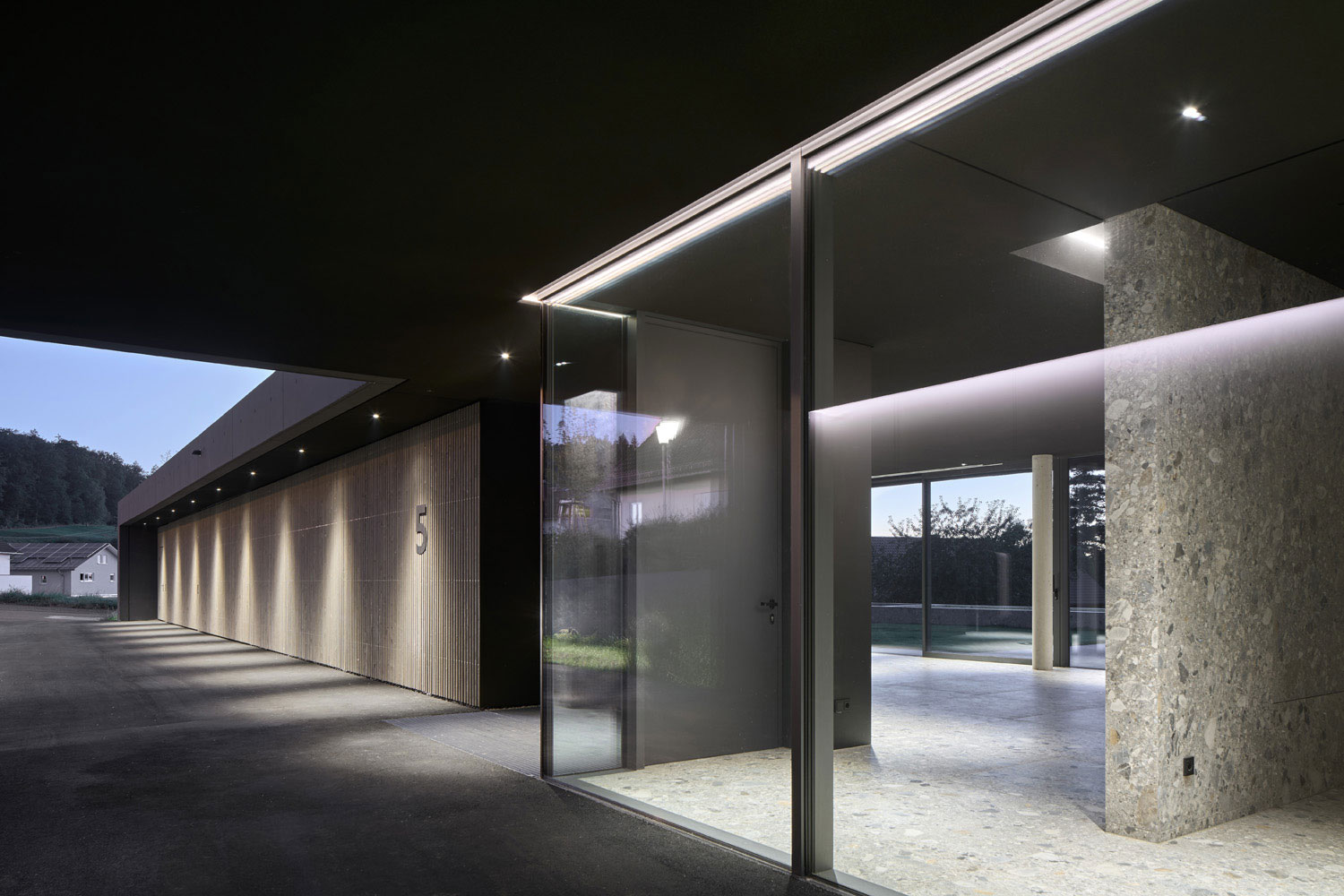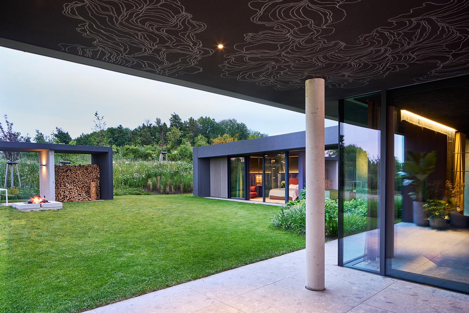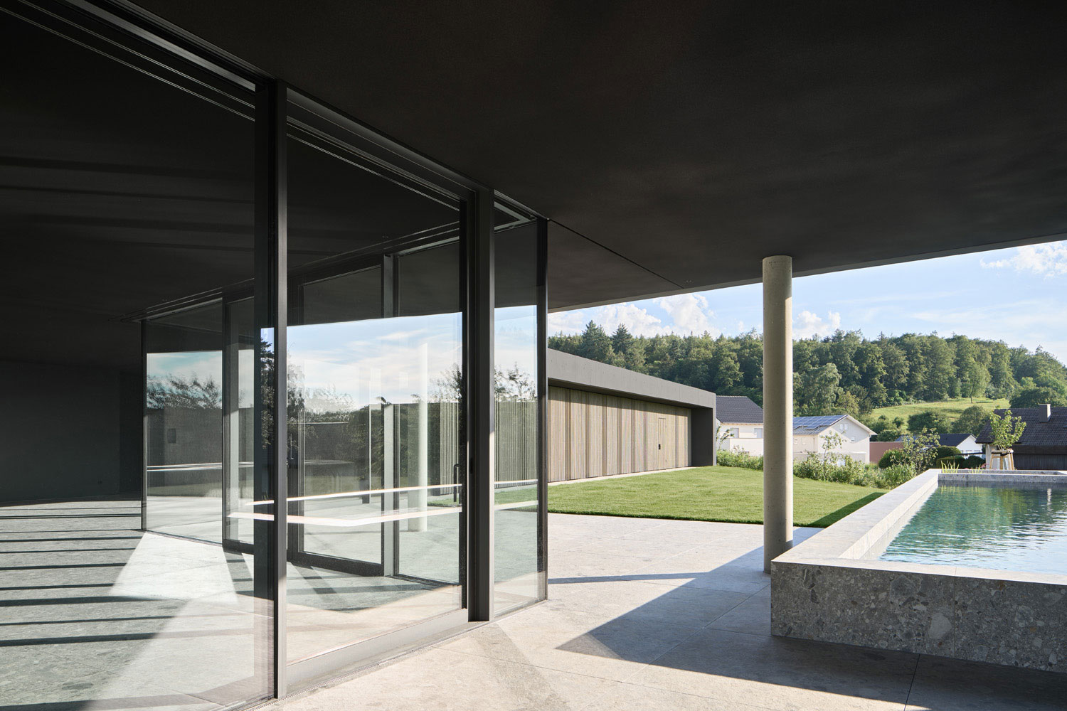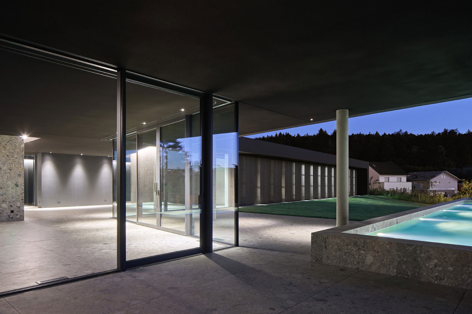 Eingebogen in die Zufahrt, führt eine Holzlamellenwand zum überdachten Hauseingang. Eingetreten eröffnet sich ein Raumkontinuum, das eine unbeschreibliche Klarheit, Homogenität und Ruhe ausstrahlt. Im gesamten Gebäude sind die Böden und Wände mit der gleichen Steinfliese belegt, die schwarzen Akustikdecken wirken immateriell, der Raum verliert seine Begrenzung, man erlebt ein ganz neues Raumgefühl. Tageslicht gleist von oben über Rahmenlose Oberlichtverglasungen über die Wände bis zum Boden. Alle raumhohen Verglasungen sind profilminimiert, das Boden- und Deckenprofil fußboden- bzw. deckenbündig eingelassen. Auf den Terrassen im Außenbereich liegt der gleiche Boden wie innen, auch der Pool hat die gleiche Oberfläche. Die schwarzen Decken fließen wie alle anderen Oberflächen von innen nach außen durch.