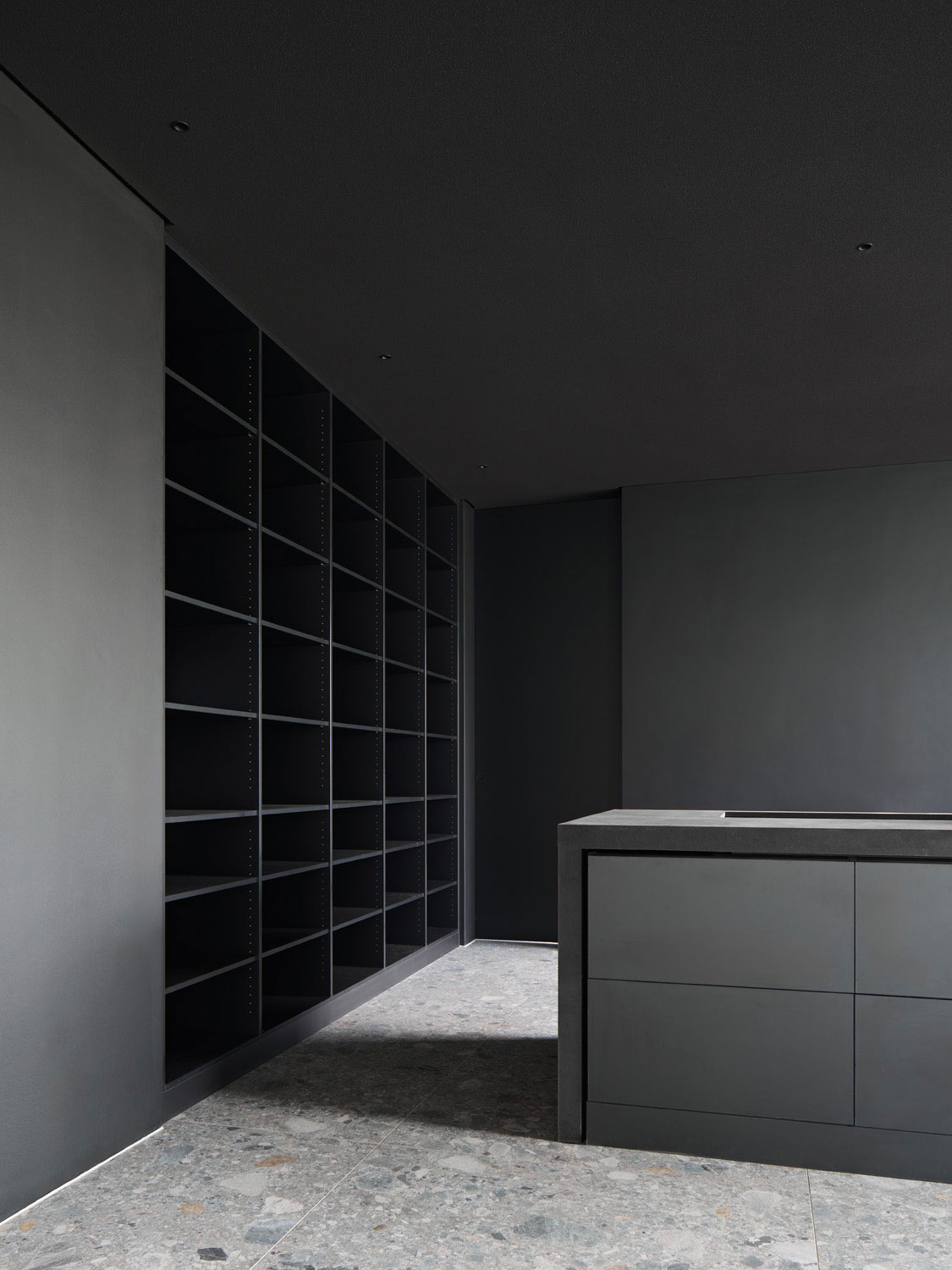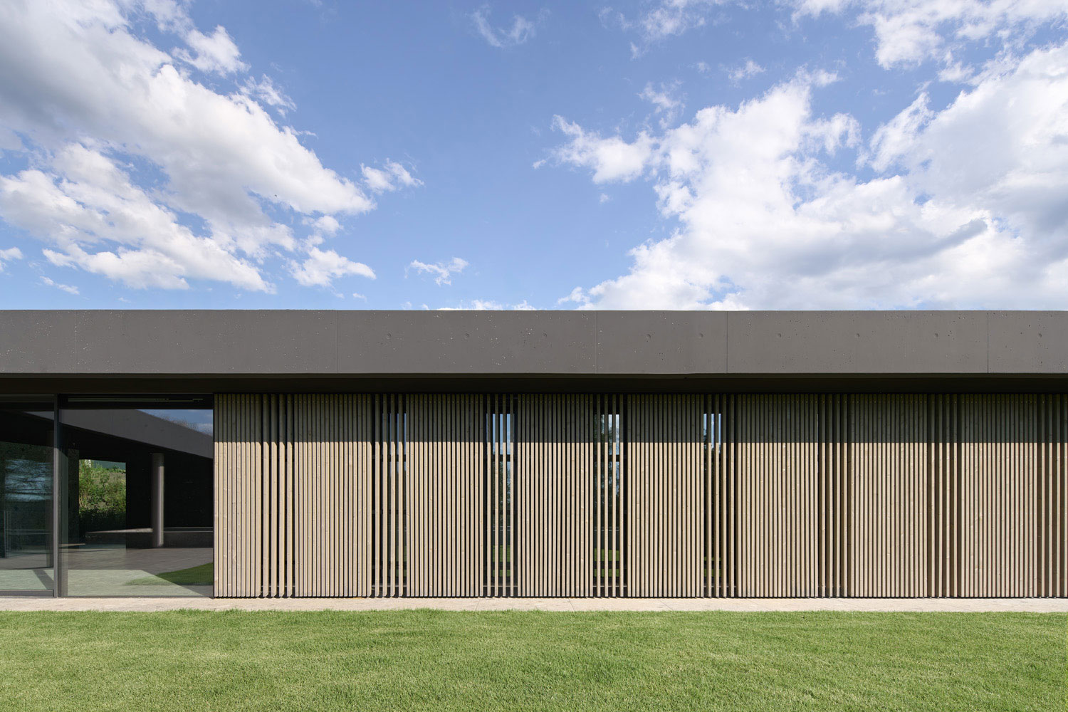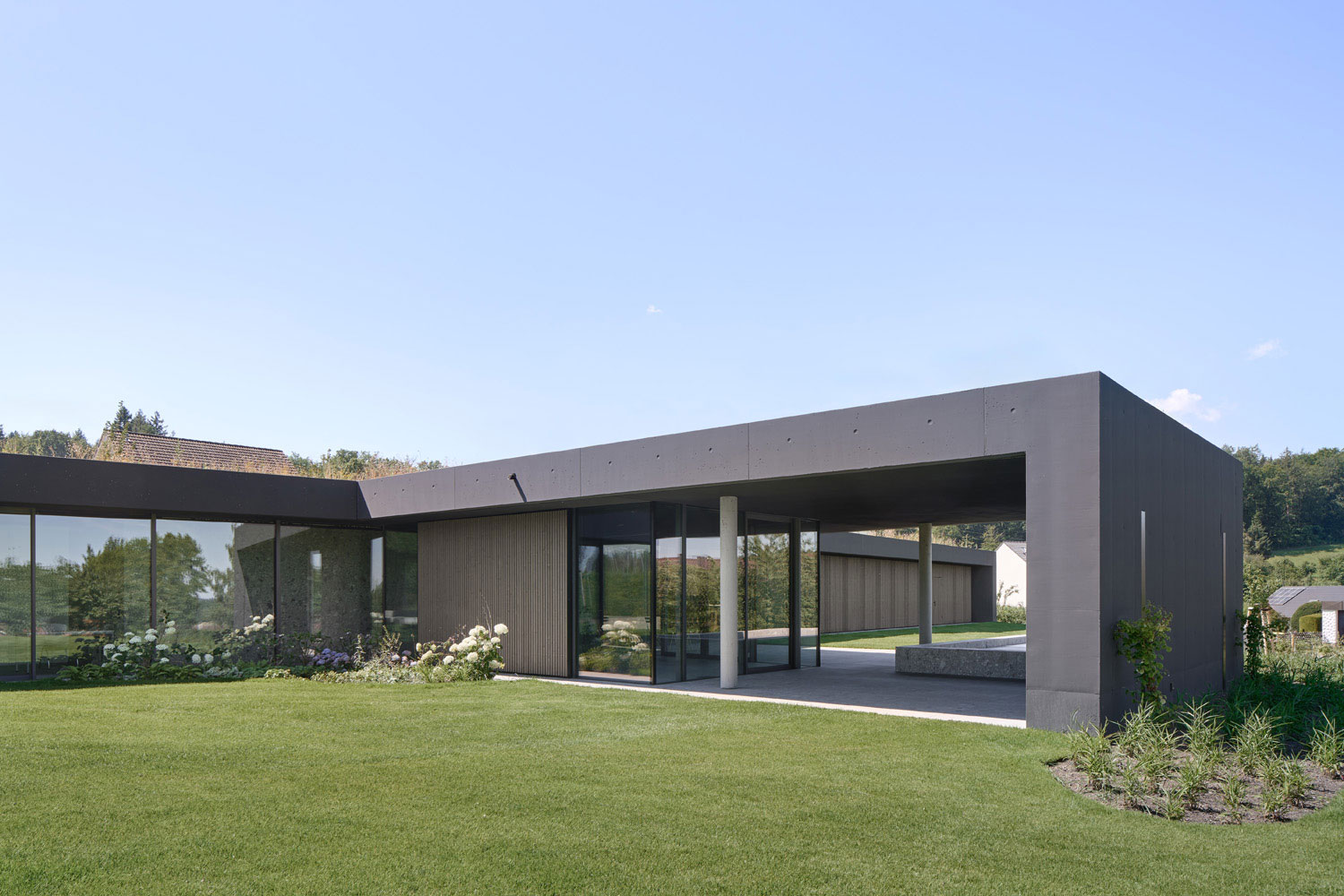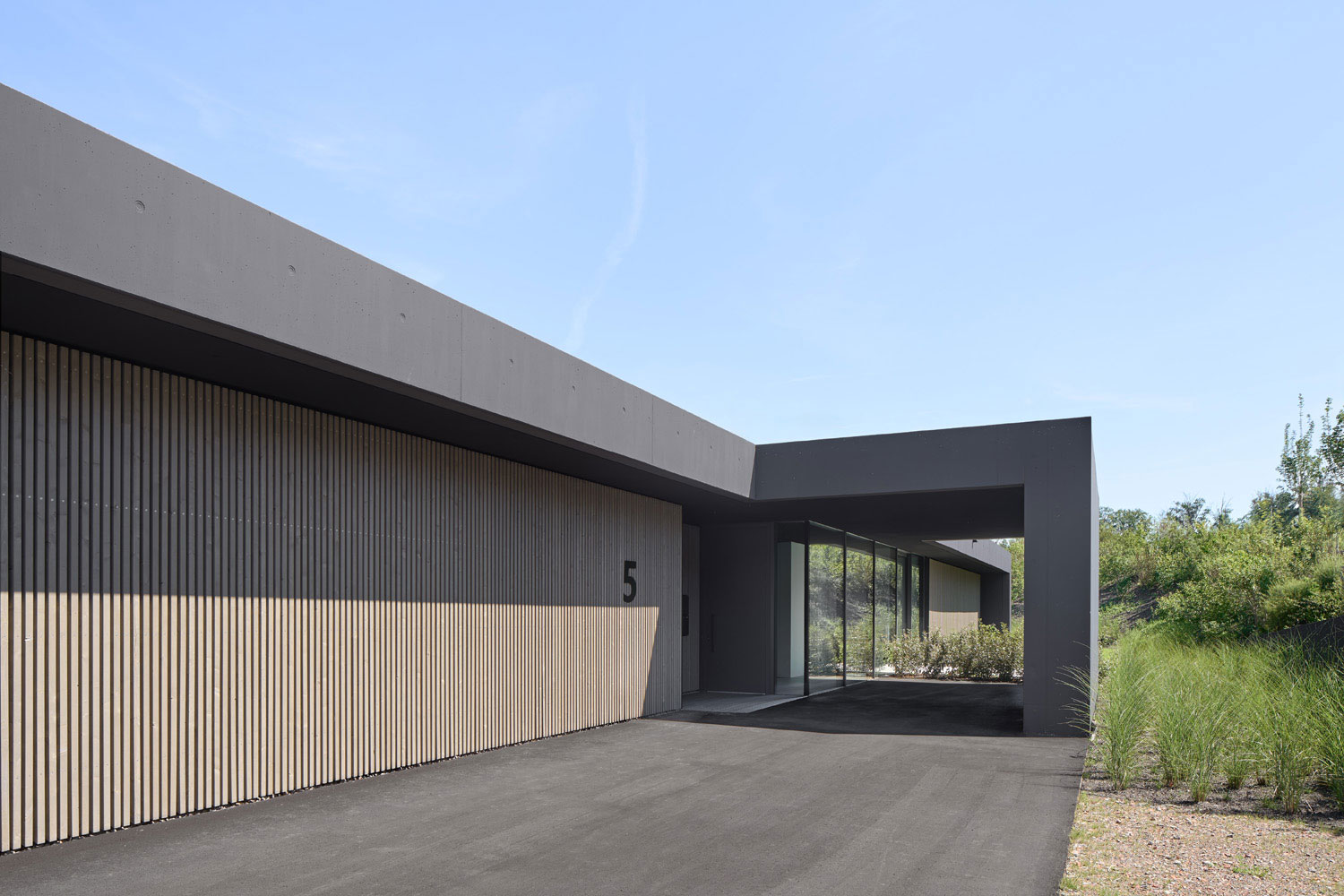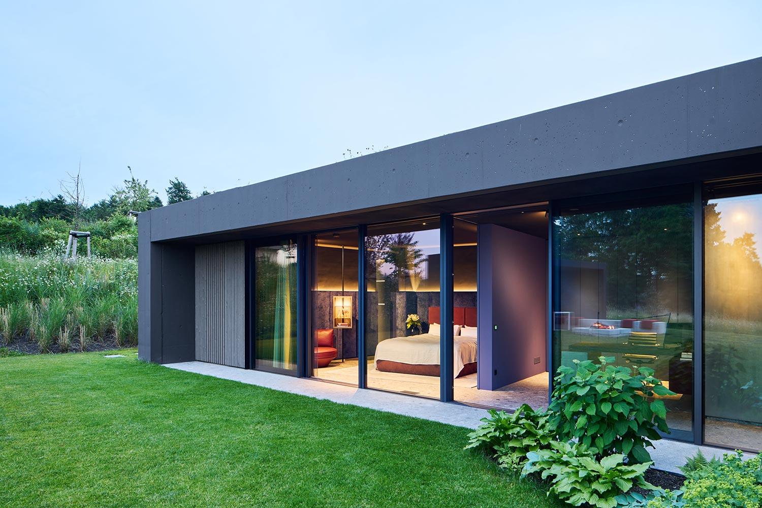 Eingebogen in die Zufahrt, führt eine Holzlamellenwand zum überdachten Hauseingang. Eingetreten eröffnet sich ein Raumkontinuum, das eine unbeschreibliche Klarheit, Homogenität und Ruhe ausstrahlt. Im gesamten Gebäude sind die Böden und Wände mit der gleichen Steinfliese belegt, die schwarzen Akustikdecken wirken immateriell, der Raum verliert seine Begrenzung, man erlebt ein ganz neues Raumgefühl. Tageslicht gleist von oben über Rahmenlose Oberlichtverglasungen über die Wände bis zum Boden. Alle raumhohen Verglasungen sind profilminimiert, das Boden- und Deckenprofil fußboden- bzw. deckenbündig eingelassen. Auf den Terrassen im Außenbereich liegt der gleiche Boden wie innen, auch der Pool hat die gleiche Oberfläche. Die schwarzen Decken fließen wie alle anderen Oberflächen von innen nach außen durch.