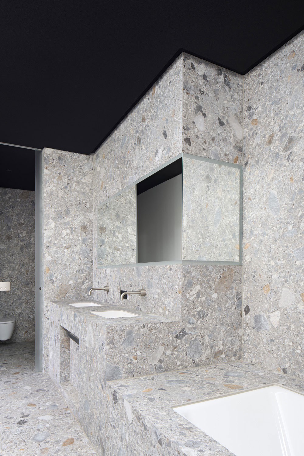 Auch in den Bädern liegt das gleiche Material an Wand und Boden, die Badmöbel sind in die Oberflächen bündig integriert, über das Oberlicht entsteht eine mystische Stimmung.