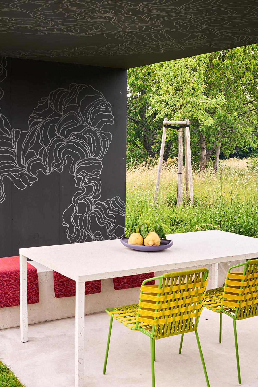Der Pool aus Sichtbeton sollte zum Schwimmen genutzt werden, also wurde er schmal, aber dafür lang. Er beginnt unter der überdachten Terrasse, schneidet also in die Terrasse ein. Das Becken ist in der Höhe so angeordnet, dass man direkt am Wasser sitzen kann. Durch die Länge des Beckens lässt sich die Topografie des Geländes ablesen.