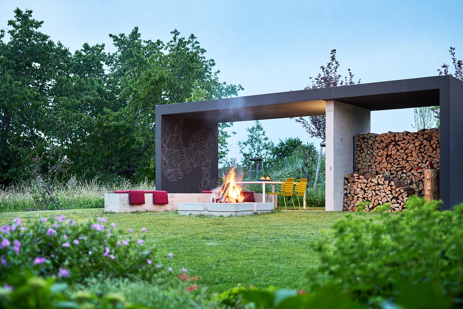 Es entstand ein zusammenhängender, kreuzförmiger Baukörper der durch seine Form die Freiflächen in vier differenzierte Außenbereiche gliedert, den Zufahrts-/Eingangsbereich, den Außenbereich für den Gast, den Rückzugsgarten mit Feuerstelle und den Hauptgarten mit Terrasse und Pool.