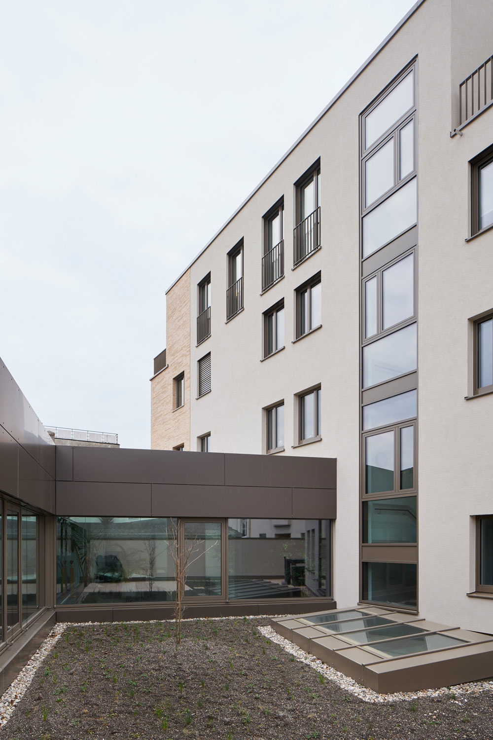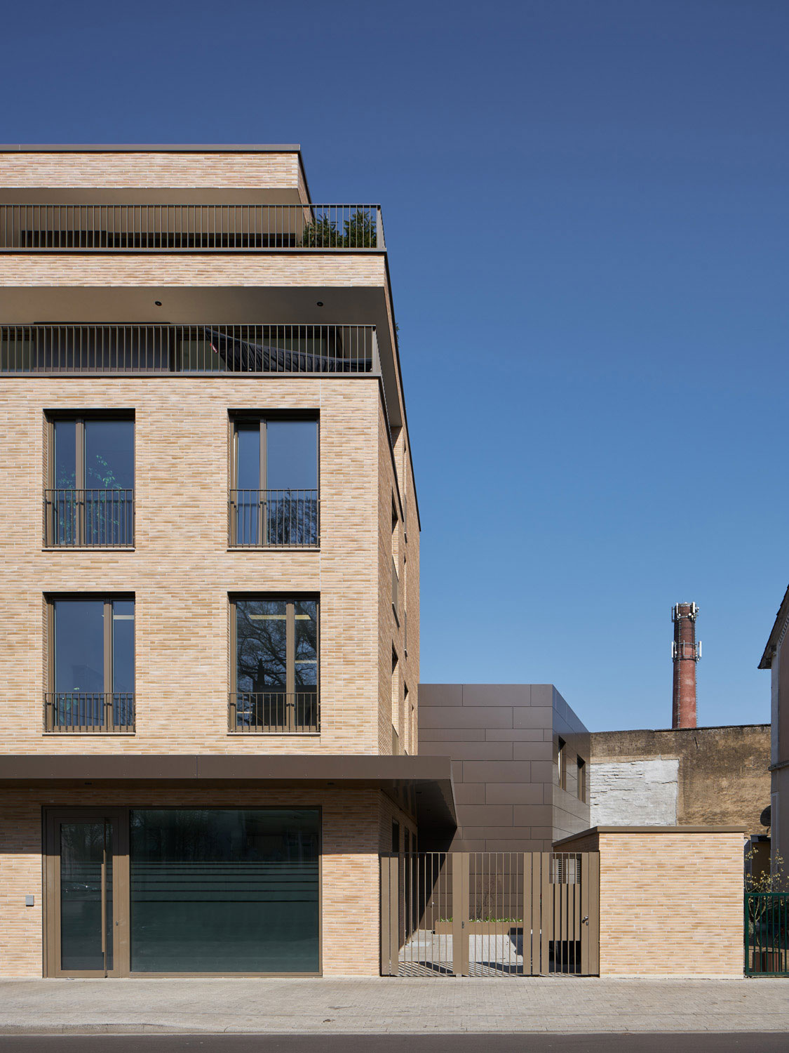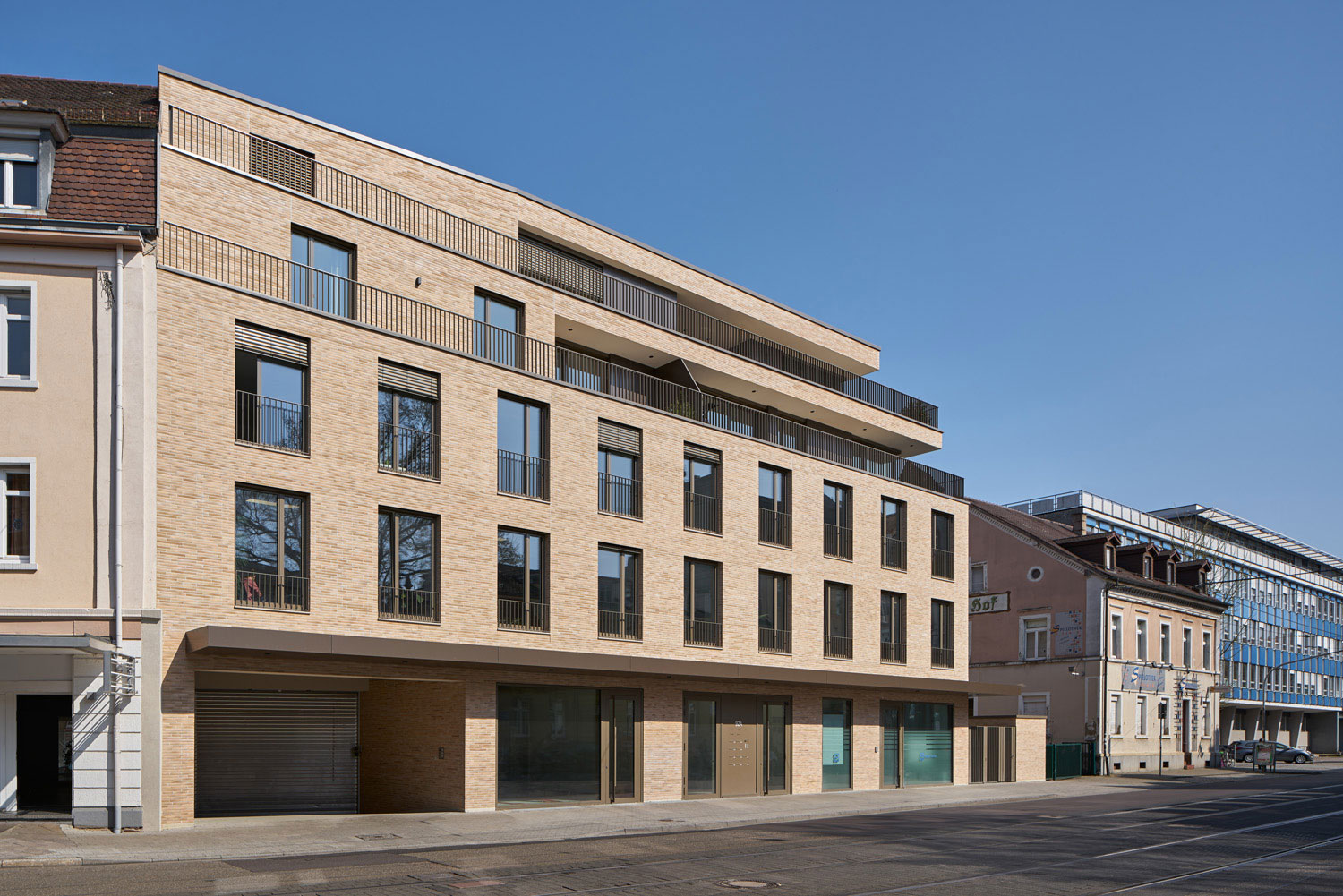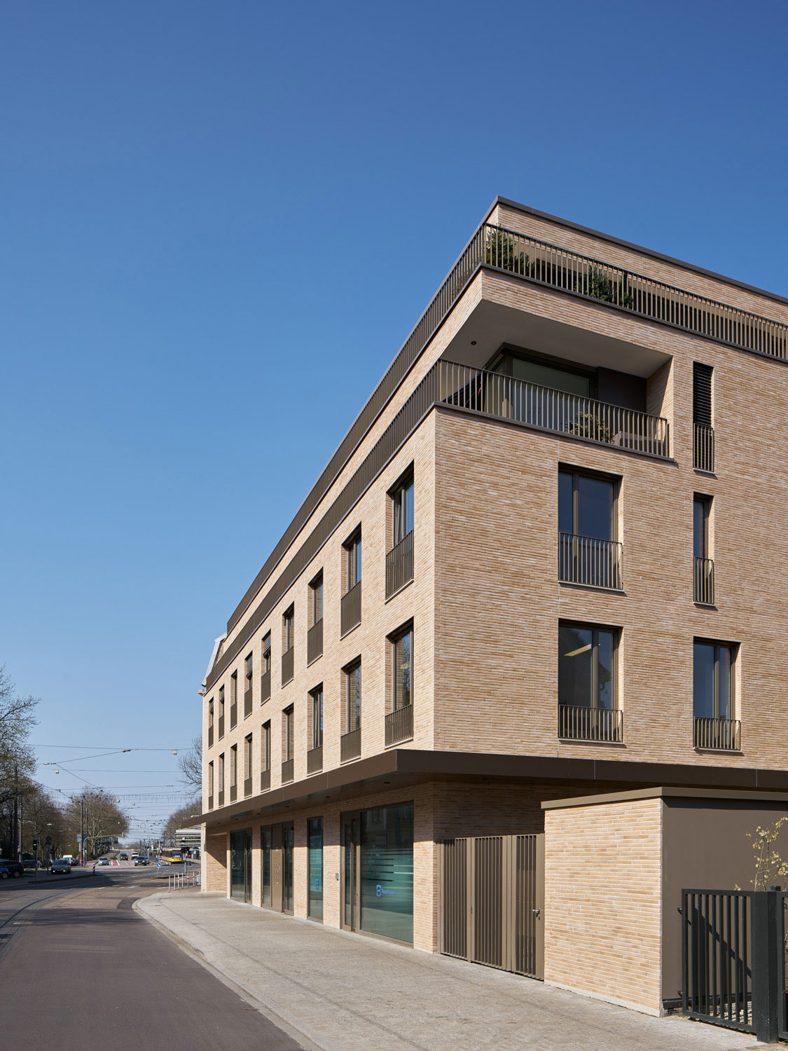 Es entstand ein Stadtbaustein der sich städtebaulich in die Struktur und Körnung des Straßenzugs der Pfinztalstraße einfügt und die Lücke des Blockrands schließt. Die Gliederung der Fassade orientiert sich an der angrenzenden Gründerzeitfassade. Die Erdgeschosszone wird durch das durchlaufende Vordach betont, die Obergeschosse leben von der Ruhe der Wiederholung und dem ausgewogenen Verhältnis von Wand zu Öffnung, der Dachbereich staffelt sich unaufdringlich zurück. Das rückwärtige zweigeschossige Gebäude ist in seiner Materialität und Farbigkeit unterschiedlich zum Hauptbaukörper gestaltet, um dem Ensemble die Wucht zu nehmen und den Schwerpunkt auf das Klinkergebäude zu setzen. Die Farbe des Klinkers ist in Anlehnung des gelben Sandsteins der Altbauten gewählt.