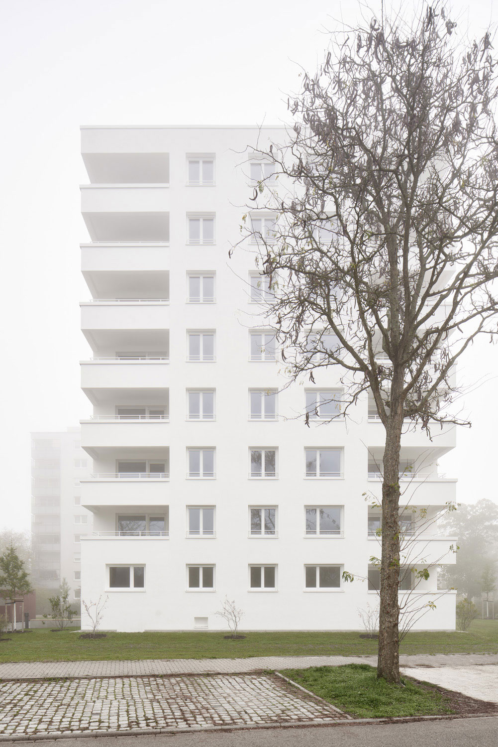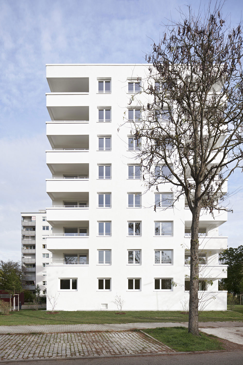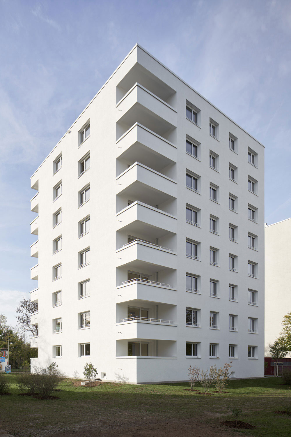 Die Balkone / Loggien mit den massiven Brüstungen setzen klare Schwerpunkte in den Fassaden, der zurückgezogene Hauptzugang mit den eingeschwenkten Seitenwänden kommt ohne zusätzliche Vordachkonstruktionen aus und trägt zum ruhigen Gesamtbild entscheidend bei. Im Treppenhaus finden sich robuste Materialien in feiner Farbabstimmung. Griffe, Handläufe sind aus geölter Eiche, der schwarze Betonwerkstein mit seinen beigen Farbeinschlüssen in Verbindung mit dem weiß lackierten Stahlgeländer reichen aus, um dem Besucher Wertigkeit zu vermitteln. Es entstand ein gestapelter Dreispänner mit zentral gelegener Vertikalerschließung.