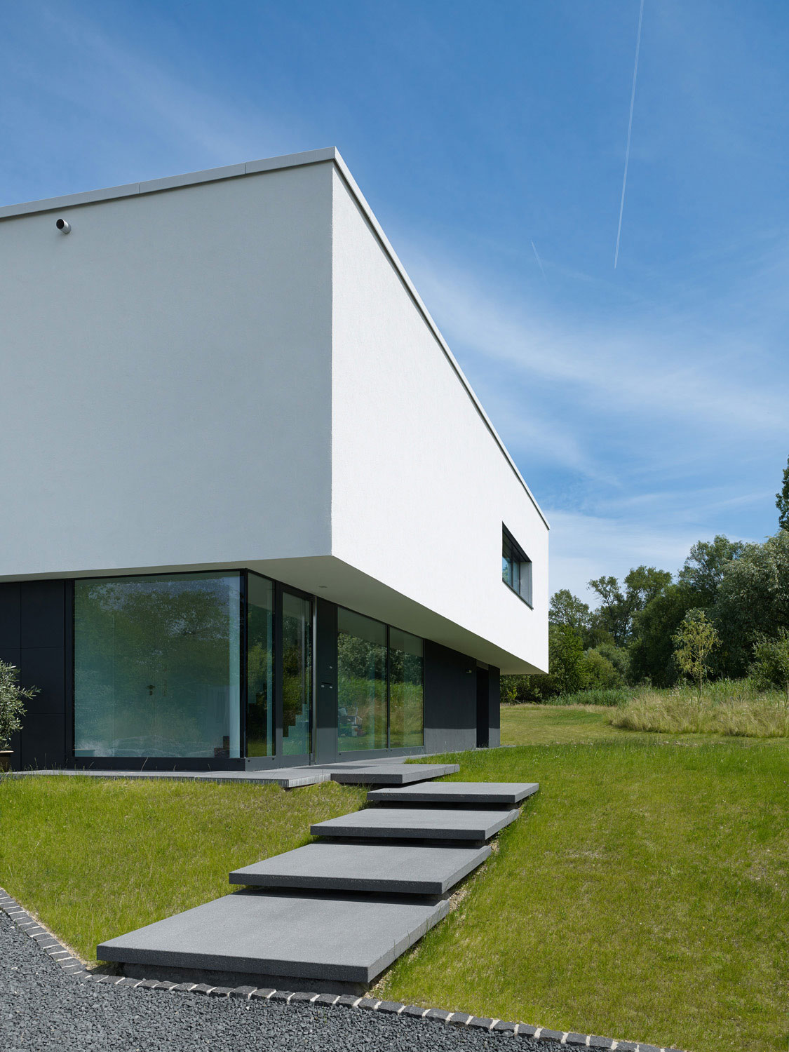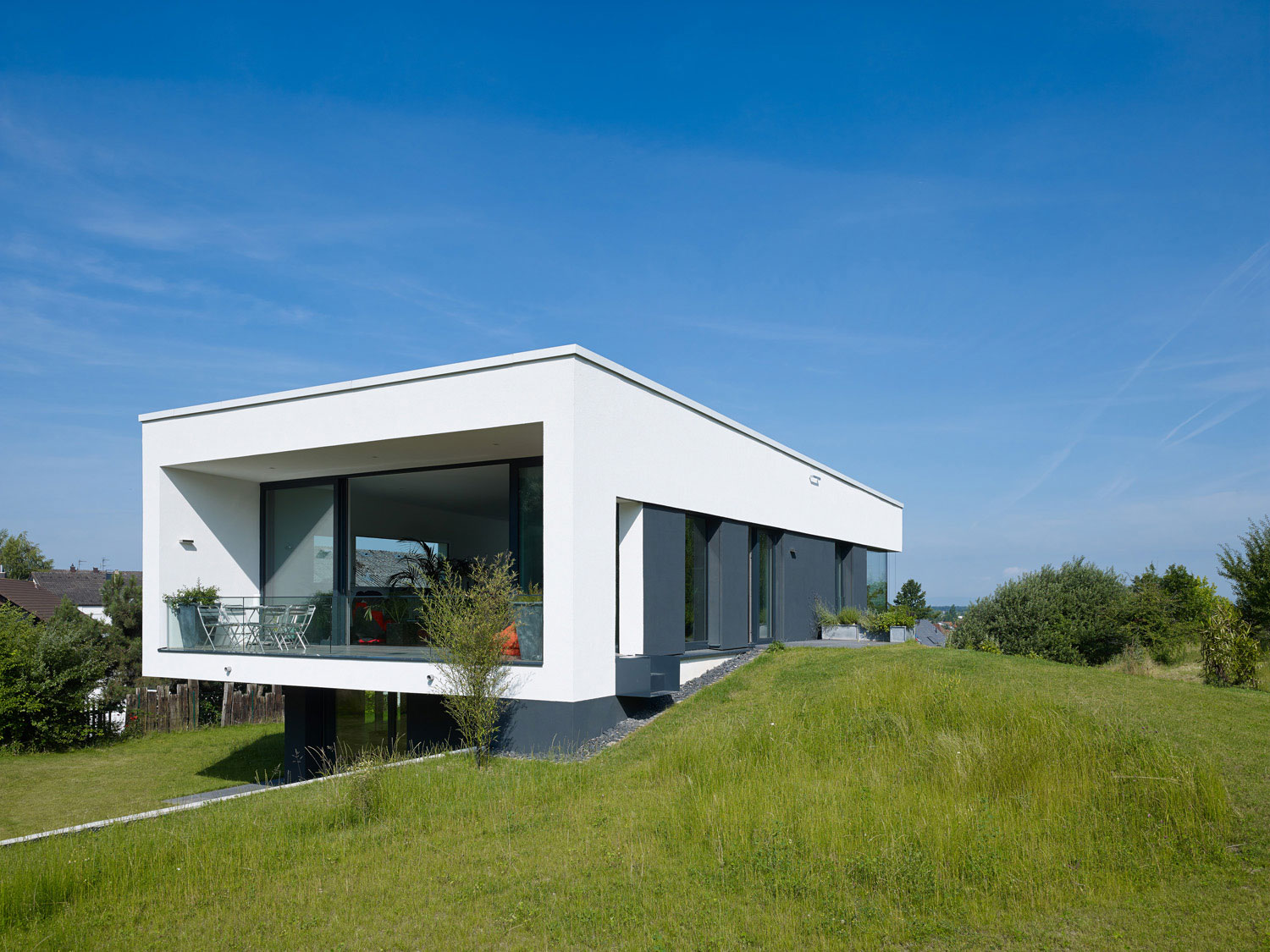 So passt sich der zweigeschossige Baukörper in seiner langgestreckten Kubatur dem Verlauf des Grundstücks an und die Kubatur wird durch ein geneigtes Flachdach in Richtung Südosten erhöht.