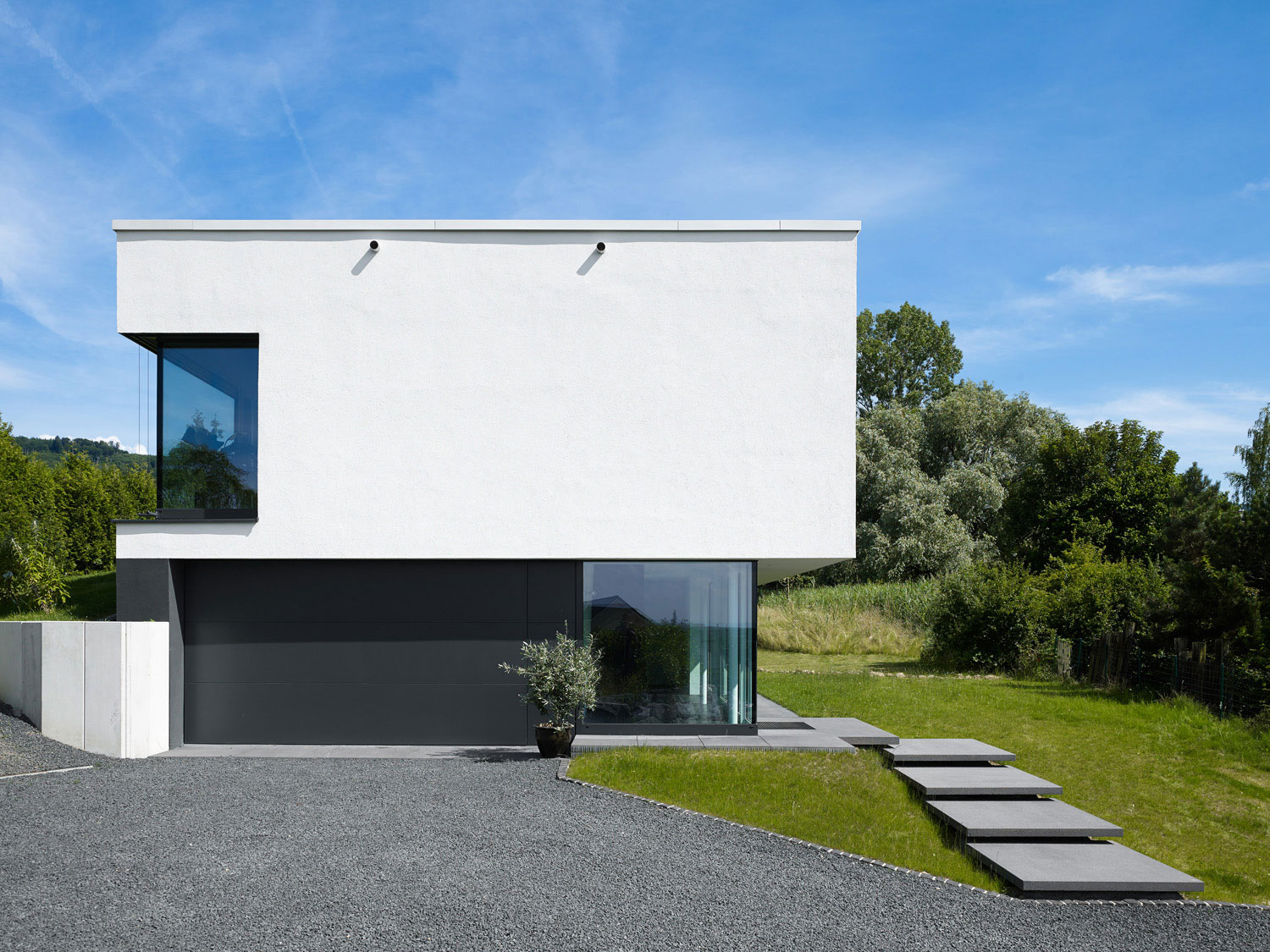 Von außen folgt die Gestaltung des Baukörpers dieser Zweiteilung der Funktionen: das Erdgeschoss, in dem sich die Nebenräume befinden, ist farblich komplett in Anthrazitgrau abgesetzt und der Baukörper gegenüber dem Obergeschoss, in dem sich die Haupträume befinden, eingerückt.
