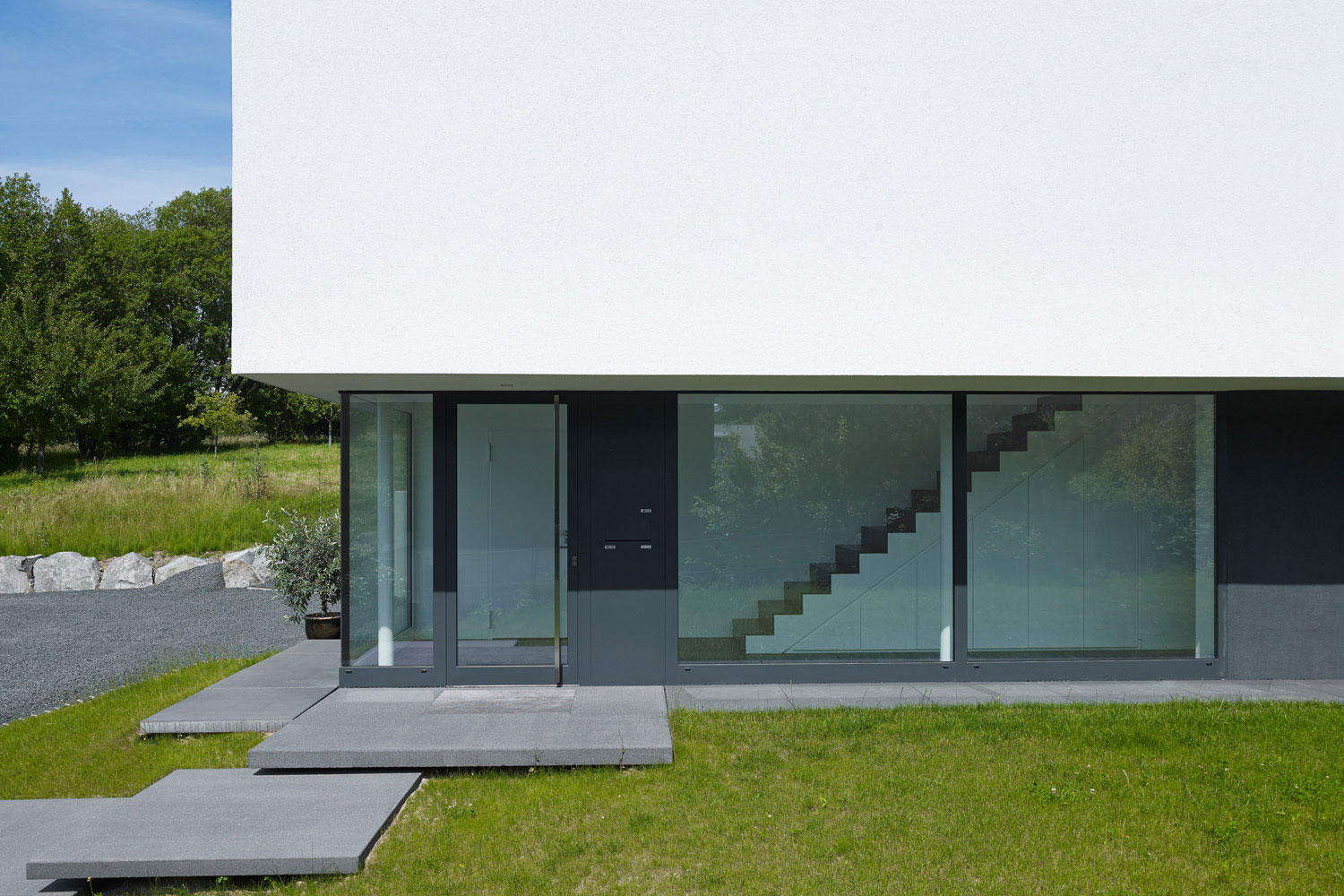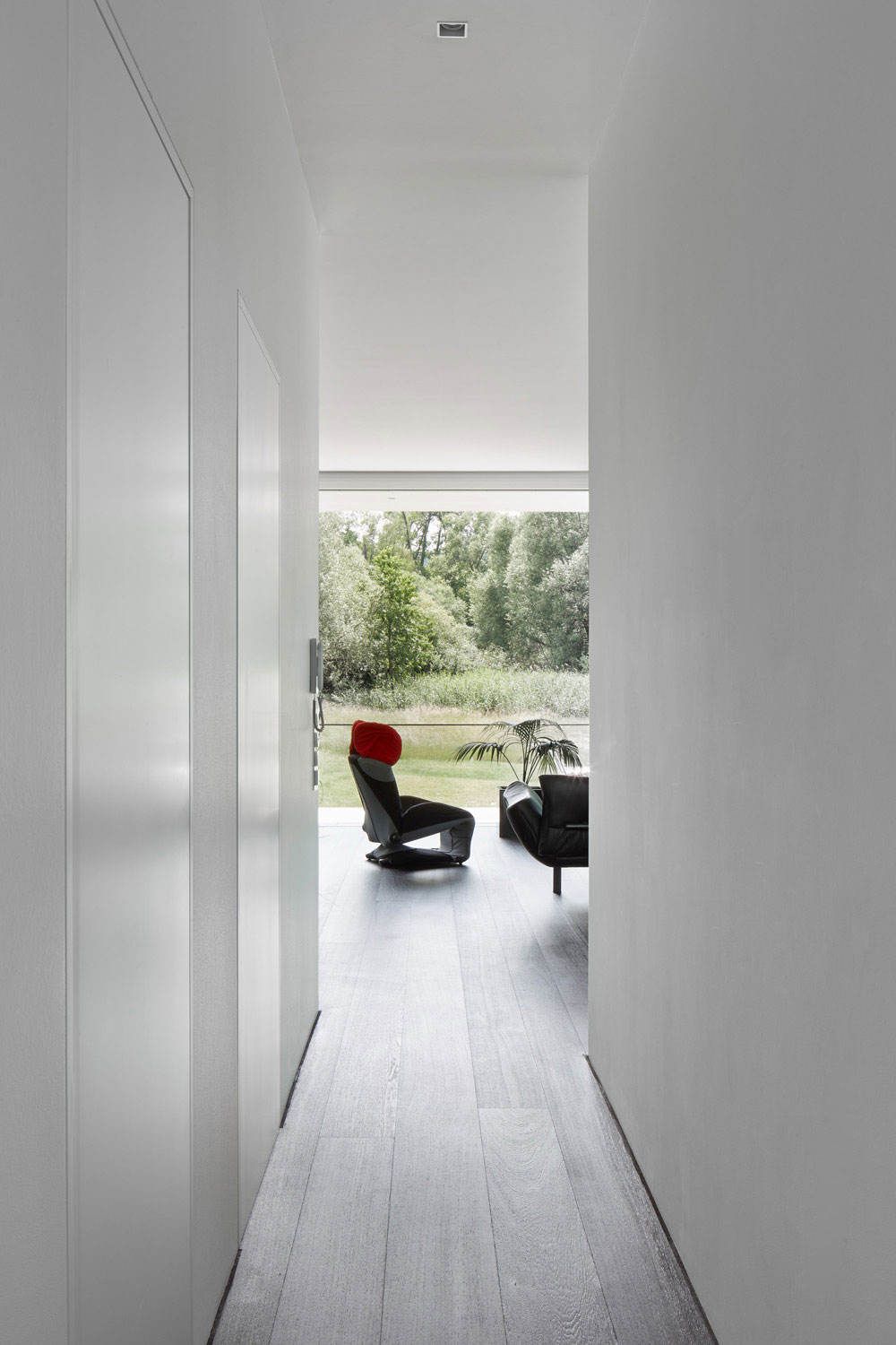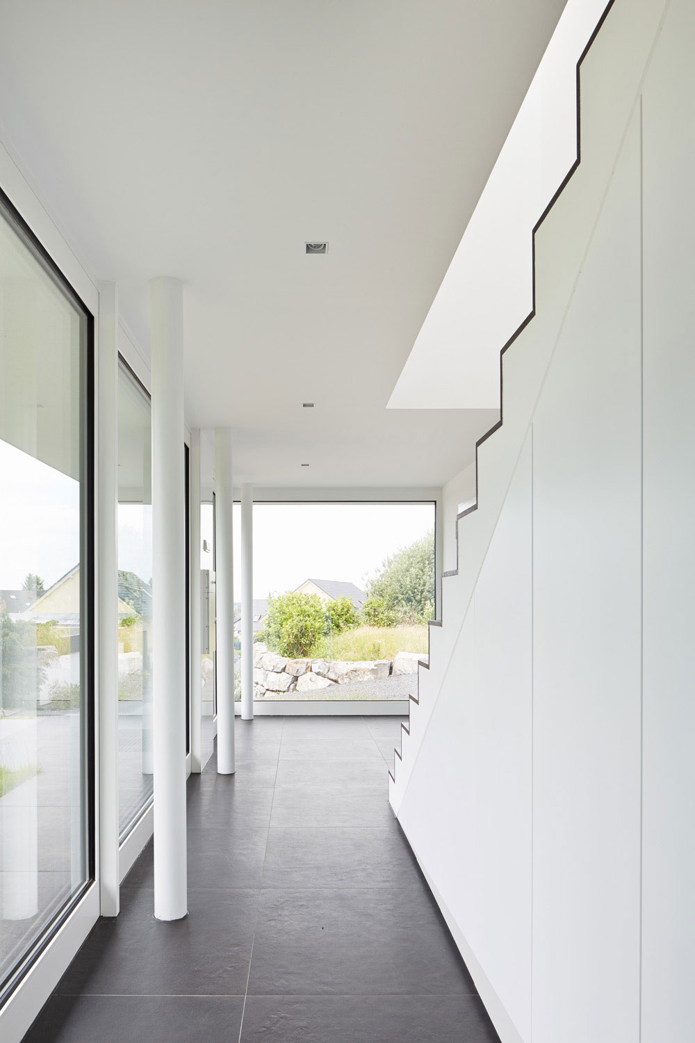 Betritt man das Gebäude durch den gläsernen Eingangsbereich, wird man sogleich über eine offene Treppe nach oben in den großen 3,30 m hohen Hauptraum des Wohnhauses geleitet, von wo aus sich dem Besucher der Blick durch eine raumhohe Glasfront hindurch nach außen eröffnet.