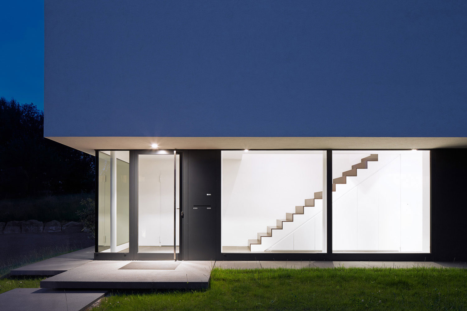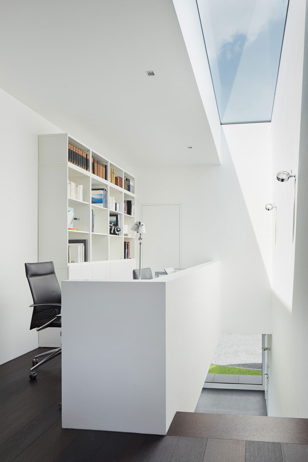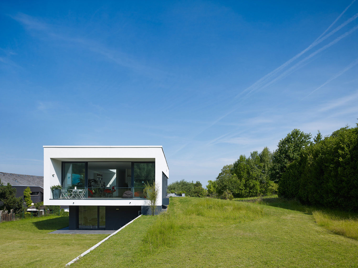 Betritt man das Gebäude durch den gläsernen Eingangsbereich, wird man sogleich über eine offene Treppe nach oben in den großen 3,30 m hohen Hauptraum des Wohnhauses geleitet, von wo aus sich dem Besucher der Blick durch eine raumhohe Glasfront hindurch nach außen eröffnet.