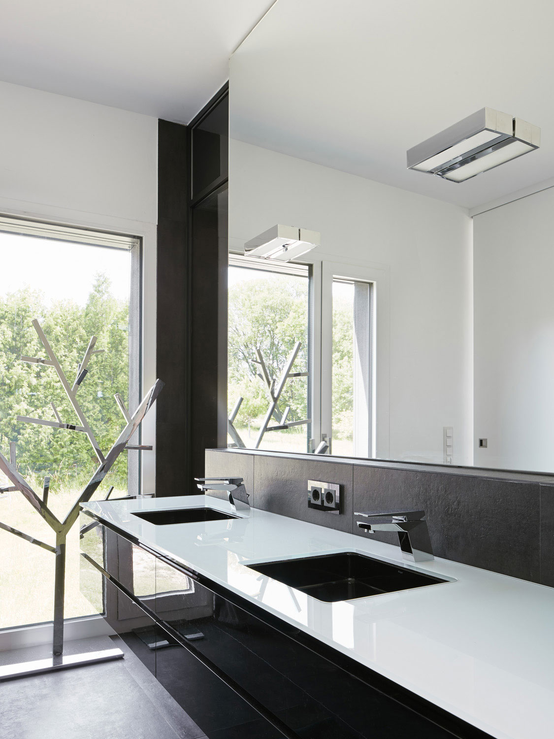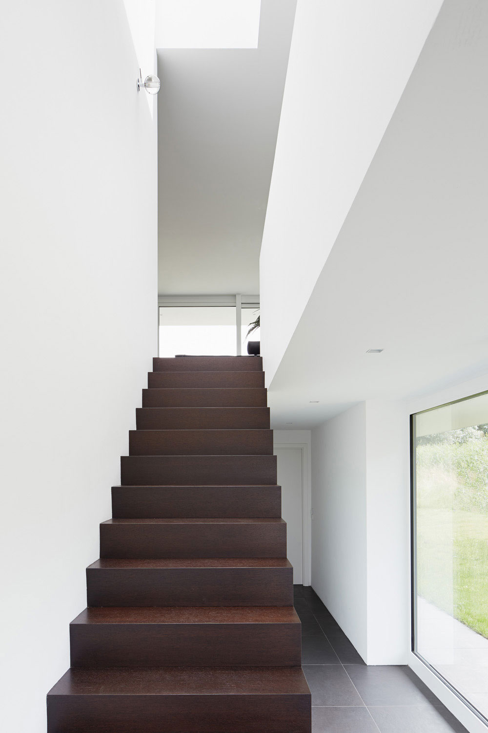 Im Kontrast zu den großen, weiten, lichtdurchfluteten Räumen, sind die Fliesen- und Holzoberflächen dunkel gestaltet. In den Wohnräumen und auf der Treppe wurde ein hochwertiger Wenge-Dielenboden verlegt.