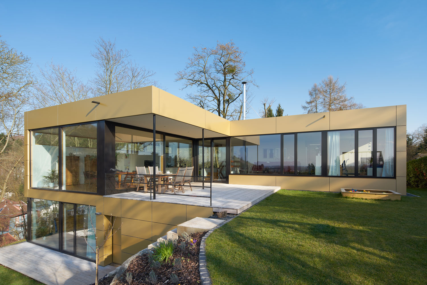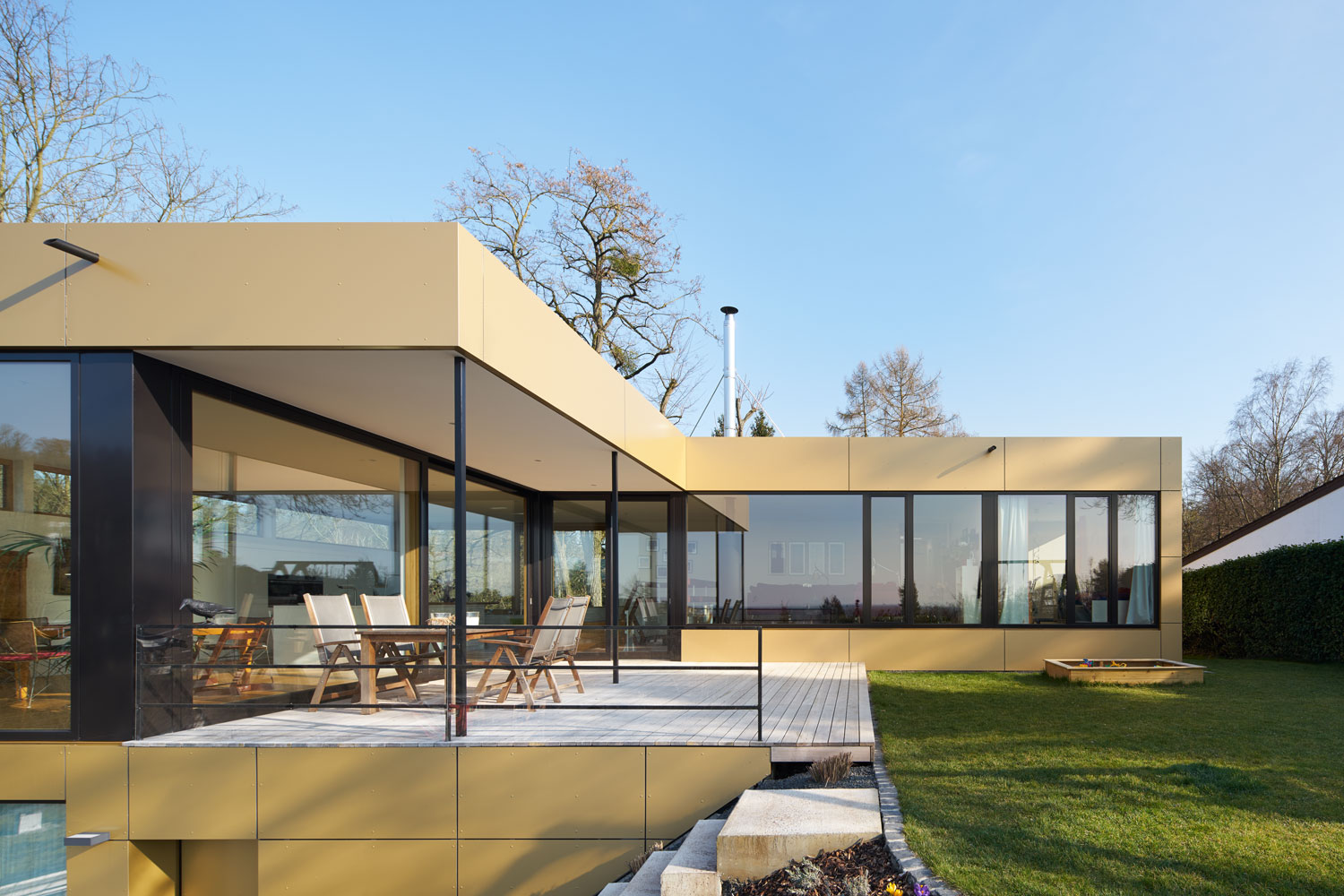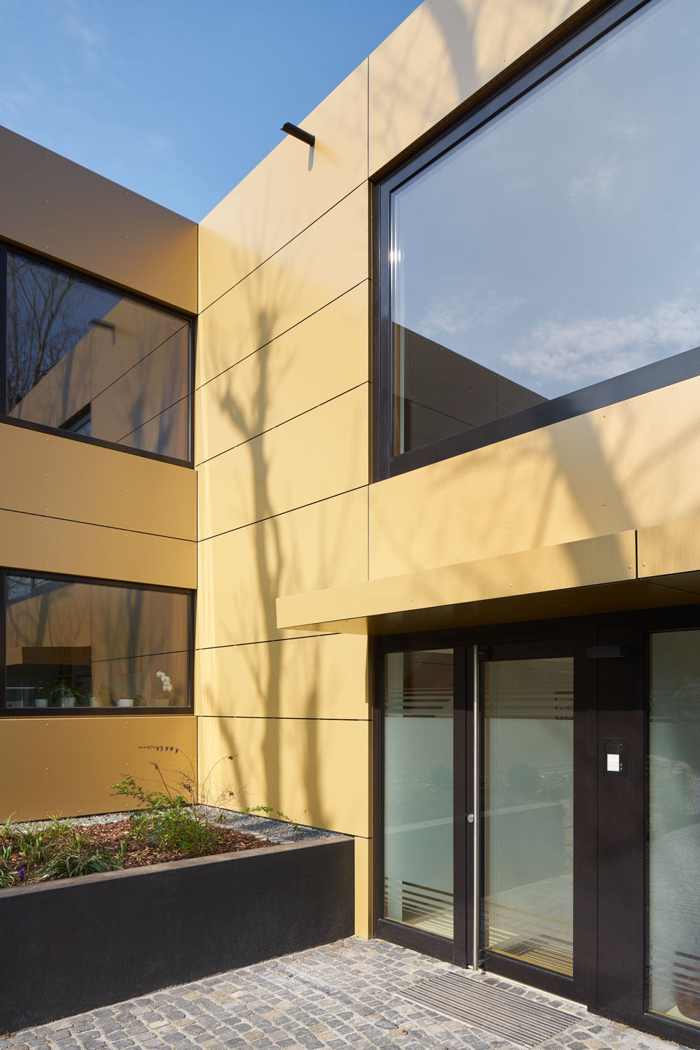 Durch den Einsatz einer vorgehängten, hinterlüfteten Metallfassade mit Mineralwolldämmung konnte diesem Anspruch Rechnung getragen werden. Die flexible Anordnung der eingesetzten goldenen Alucobond-Platten verleiht dem Gebäude eine neue Leichtigkeit und ermöglicht eine zeitgemäße Interpretation der ursprünglichen Haltung des Gebäudes.