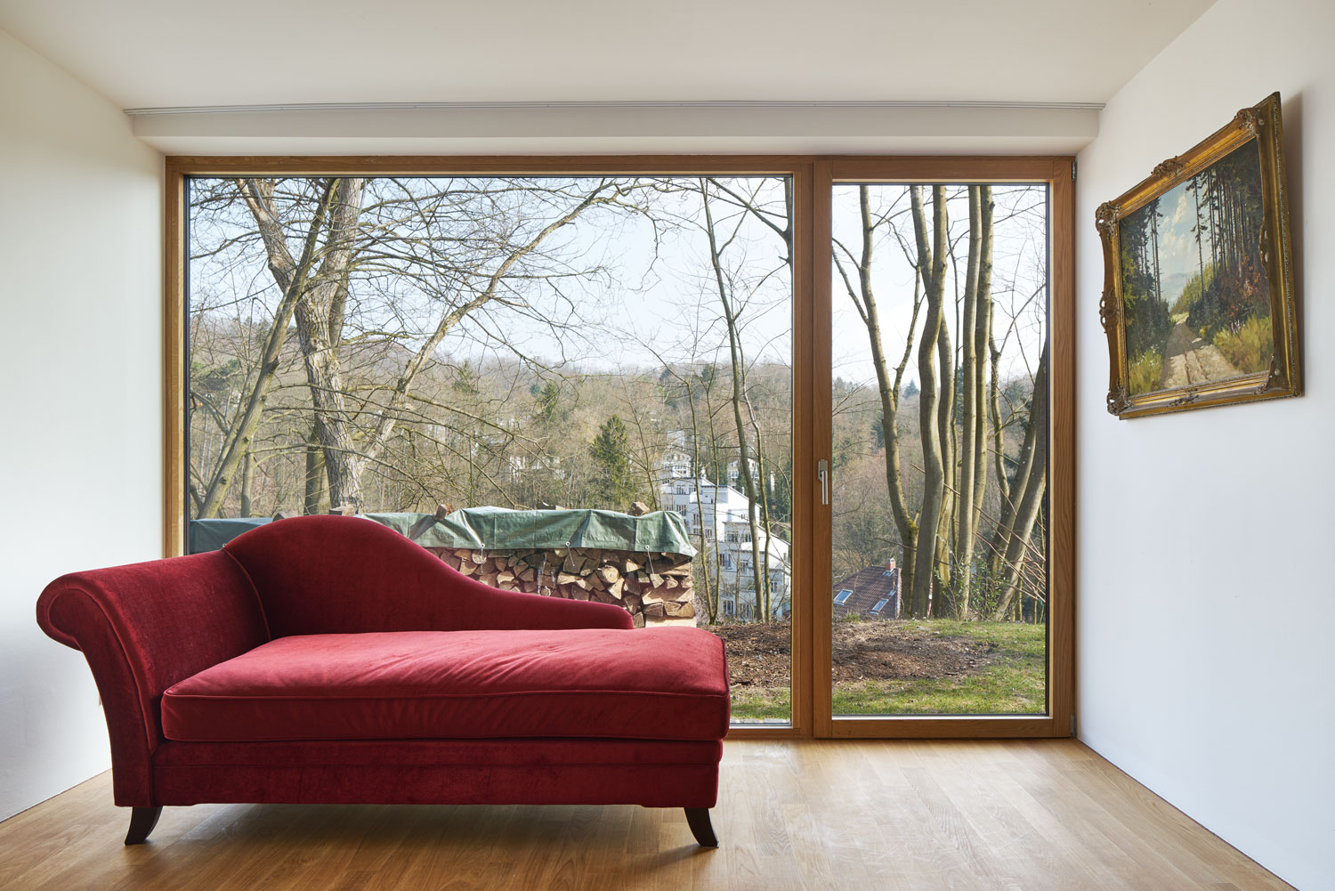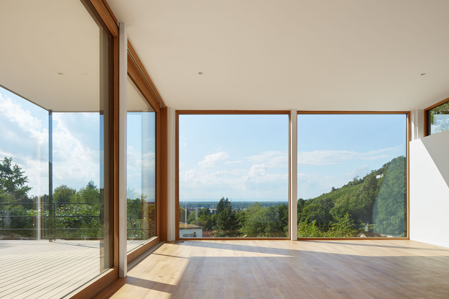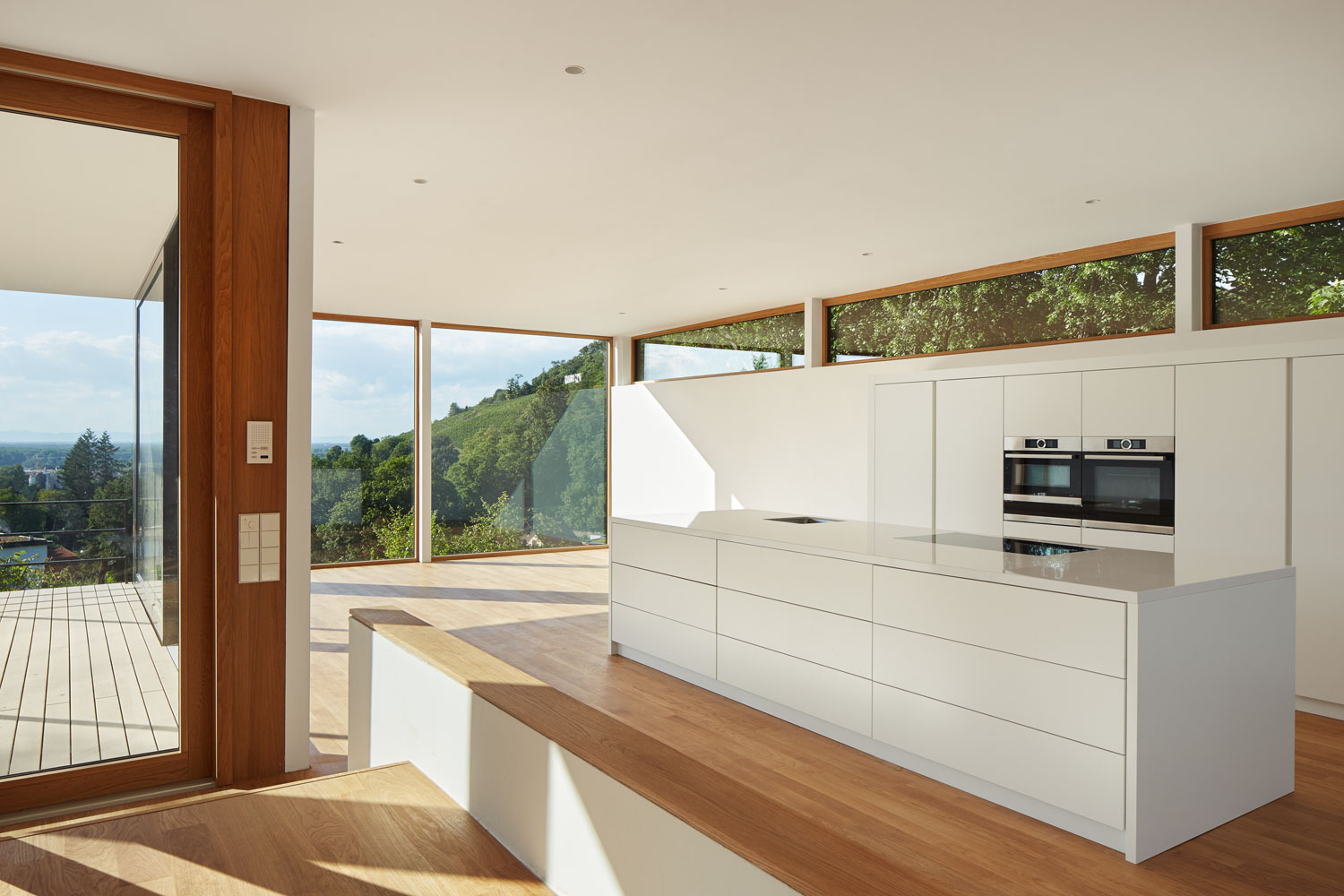 Beide Geschosse funktionieren als Split-Level, was im Obergeschoss in Verbindung mit dem durchlaufenden Flachdach einen offenen, überhöhten Koch- und Essbereich ermöglicht. Von hier schließt die neue, großzügige und in Teilen überdachte Holzterrasse mit Westausrichtung an. Dem Betrachter eröffnet sich eine einzigartige Aussicht zum nahegelegenen Turmberg sowie in das Tal als Blick über ganz Karlsruhe.