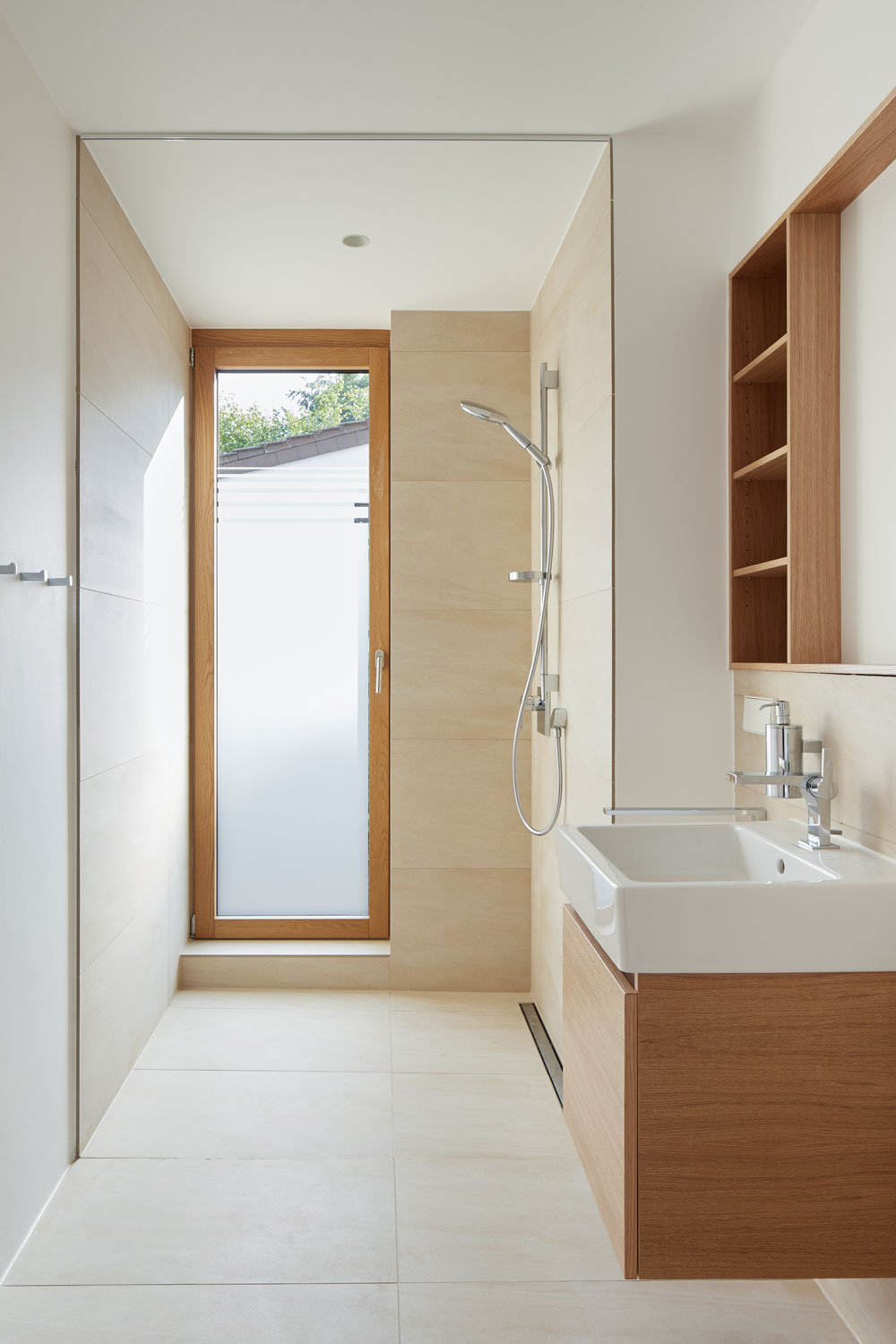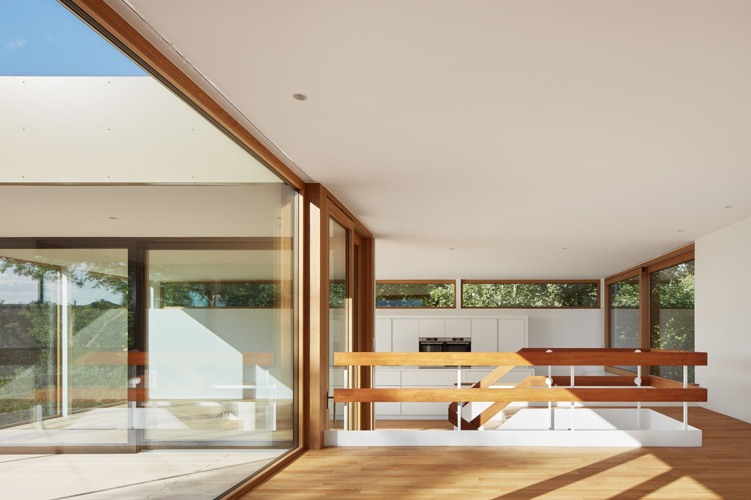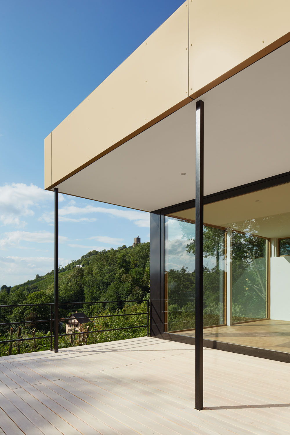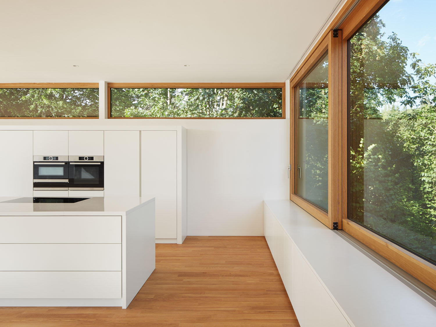 Beide Geschosse funktionieren als Split-Level, was im Obergeschoss in Verbindung mit dem durchlaufenden Flachdach einen offenen, überhöhten Koch- und Essbereich ermöglicht. Von hier schließt die neue, großzügige und in Teilen überdachte Holzterrasse mit Westausrichtung an. Dem Betrachter eröffnet sich eine einzigartige Aussicht zum nahegelegenen Turmberg sowie in das Tal als Blick über ganz Karlsruhe.