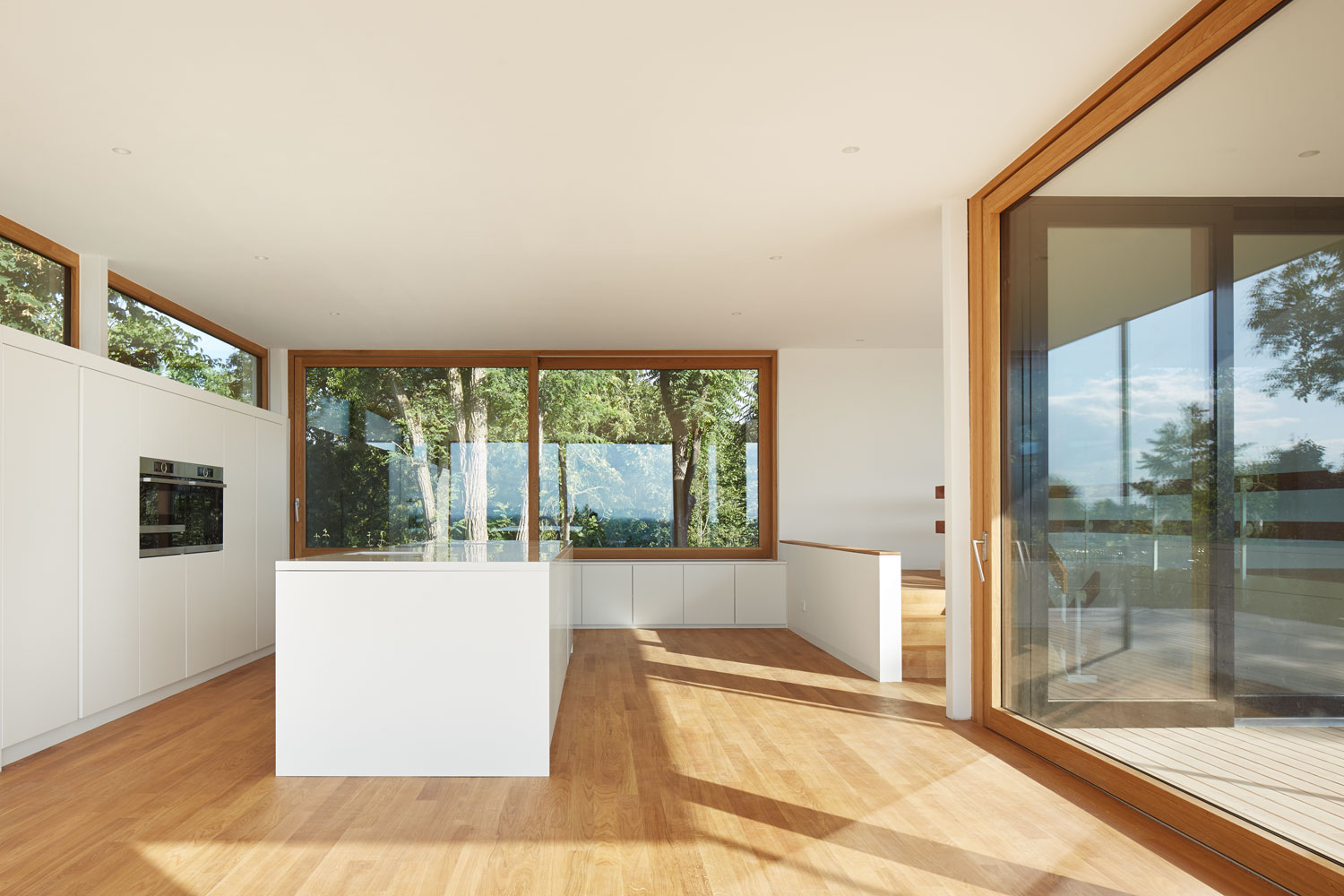 Im Zusammenspiel mit der goldenen Alucobond-Fassade wurden Holz-Aluminium-Fenster mit schwarzer Aluschale eingebaut. Nach innen wurden die Fenster holzfarben belassen - passend zum neuen Parkettboden sowie den erhaltenen Treppengeländern. Großzügige Hebe-Schiebe-Elemente bilden den Zugang zu den Terrassen und ermöglichen den fließenden Übergang von innen nach außen. Auf eine Verschattung von außen wurde verzichtet.