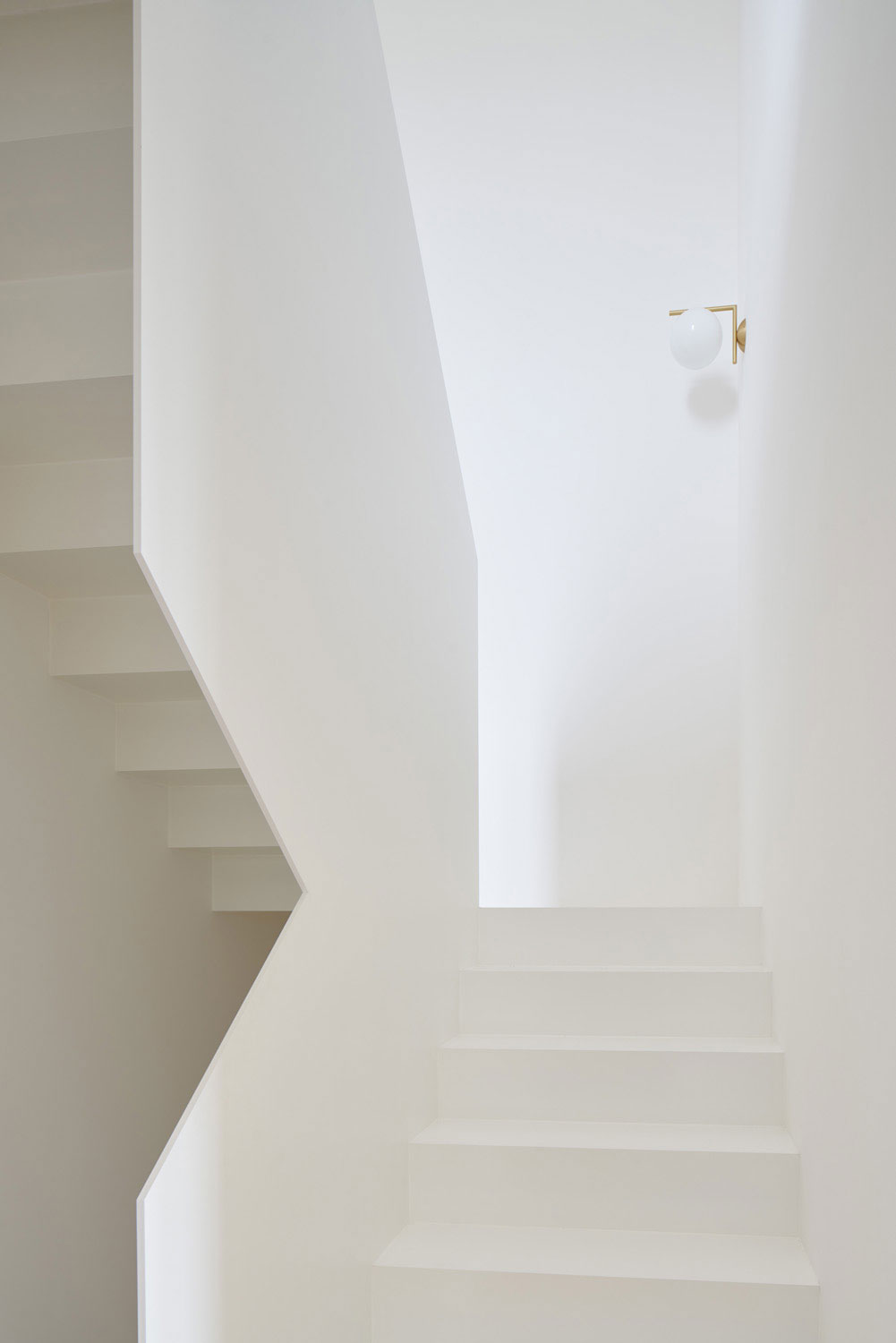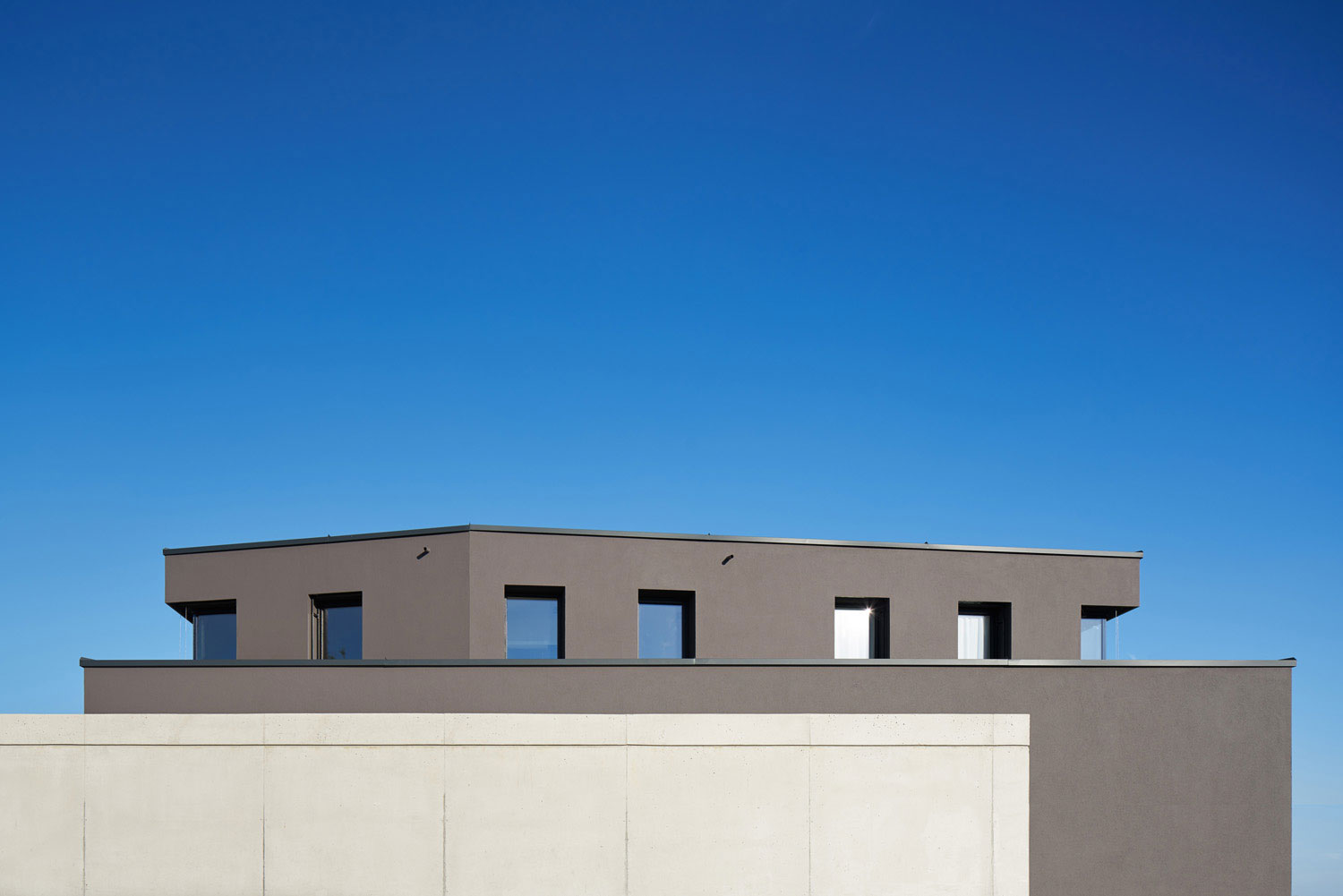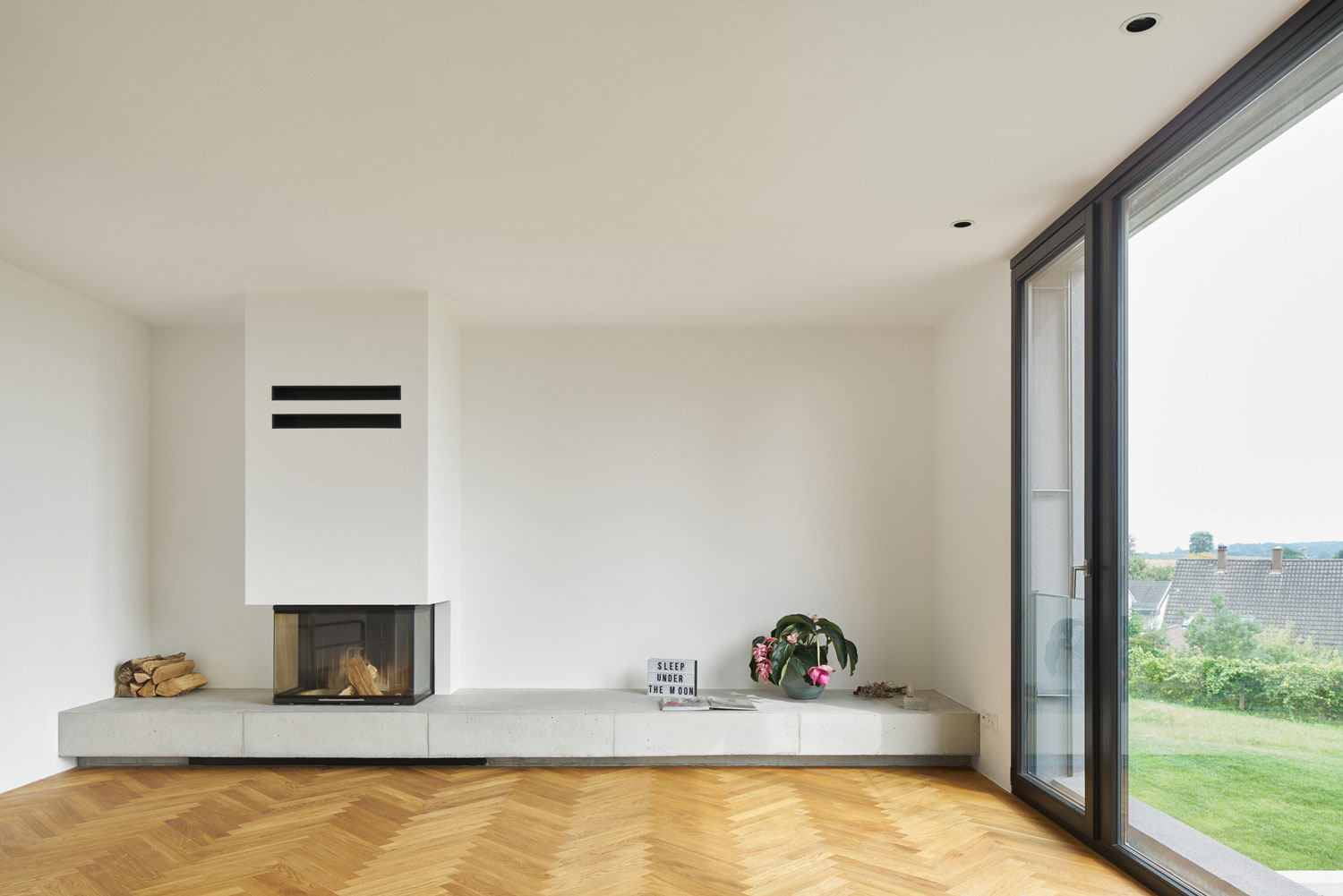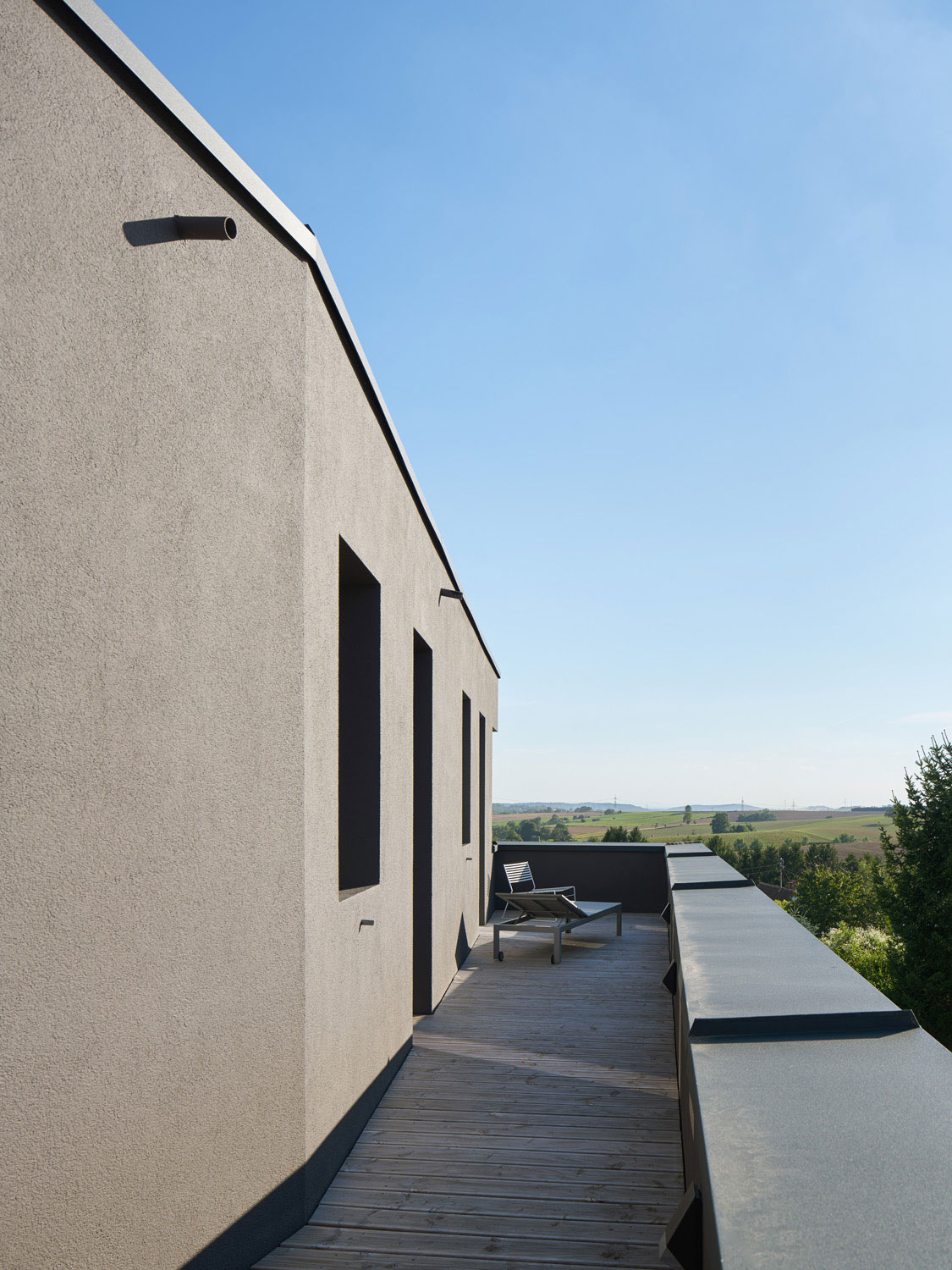 Ein scharf geschnittener Körper mit Staffelgeschoss und großer Dachterrasse erlaubt den weiten Blick ins Tal. Talseitig schmal, hoch elegant mit bodentiefen Fenstern im Untergeschoss, mit ebenerdigem Austritt auf die ins abschüssige Gelände eingeschnittene Patioterrasse. Carport und Hauseingang steht als Sichtbetonbaukörper respektvoll neben dem dunklen Wohnhaus, berührt es nicht. Im Innern ist die Form des Baukörpers im Grundriss ablesbar. Die Hanglage ermöglicht das Wohnen über drei Geschosse und somit trotz eines offenen Raumes im Erdgeschoss, genügend Privatheit für die individuellen Nutzungen der Familie.