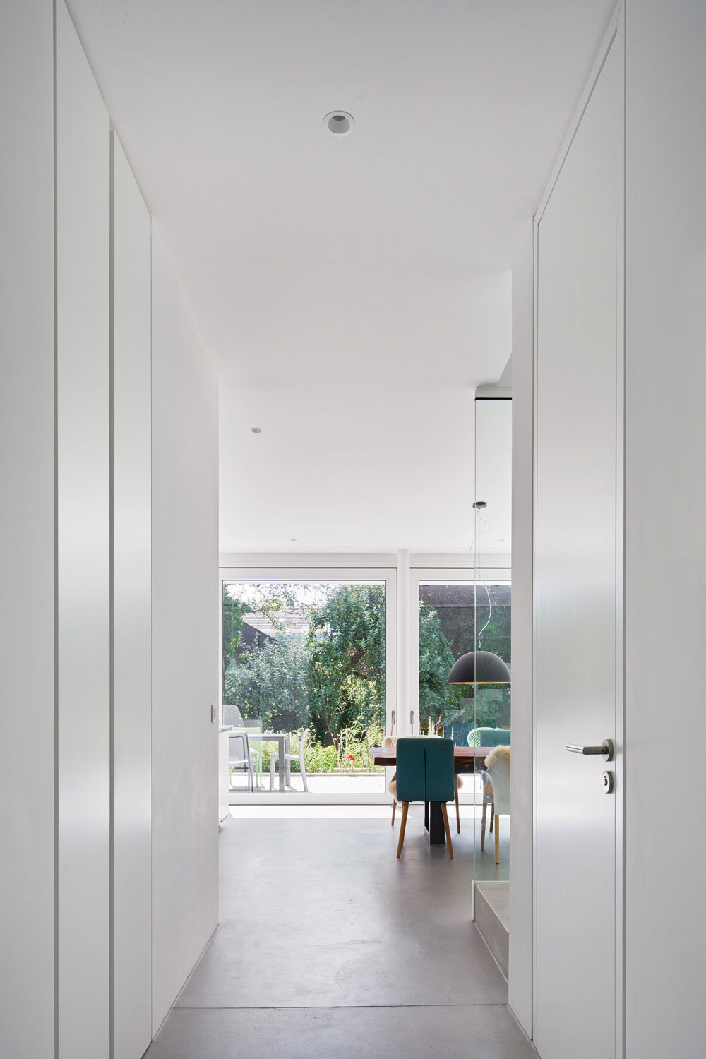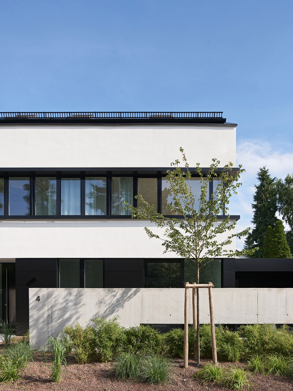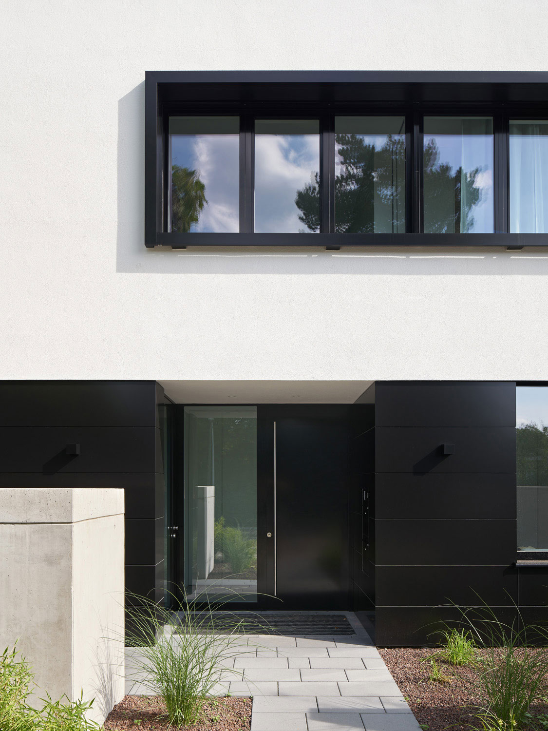 Städtebaulich waren durch den Bebauungsplan die wesentlichen Planungsparameter vorgegeben, sodass der entwurfliche Schwerpunkt auf einer auf den Bauherrn zugeschnittenen Grundrissgestaltung und anmutenden Baukörperdetaillierung lag. In der Fassadengliederung wurde das Erdgeschoss mit einer schwarzen Metallfassade gegenüber dem weiß verputzten Obergeschoss abgesetzt. Schwarz, um immateriell zu sein, das Haus wird leichter.