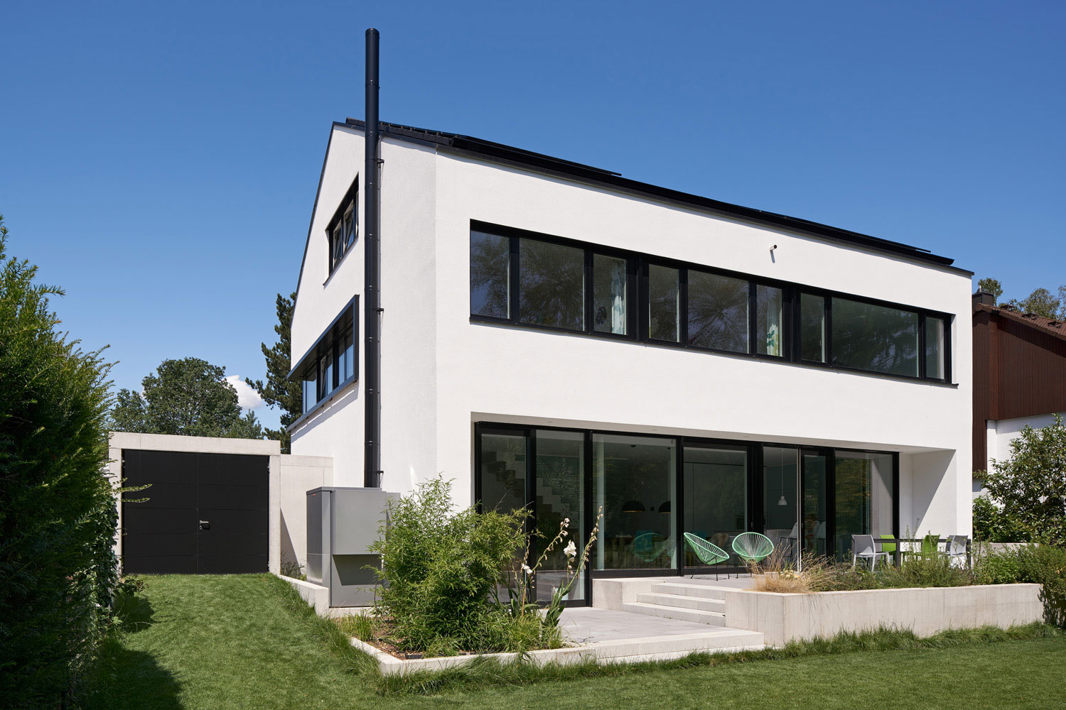 Das Wohnhaus für eine 4-köpfige Familie liegt in einem gewachsenen Wohngebiet in Karlsruhe. Es entstand ein zweigeschossiges Wohnhaus mit Einliegerwohnung im Dachgeschoss.