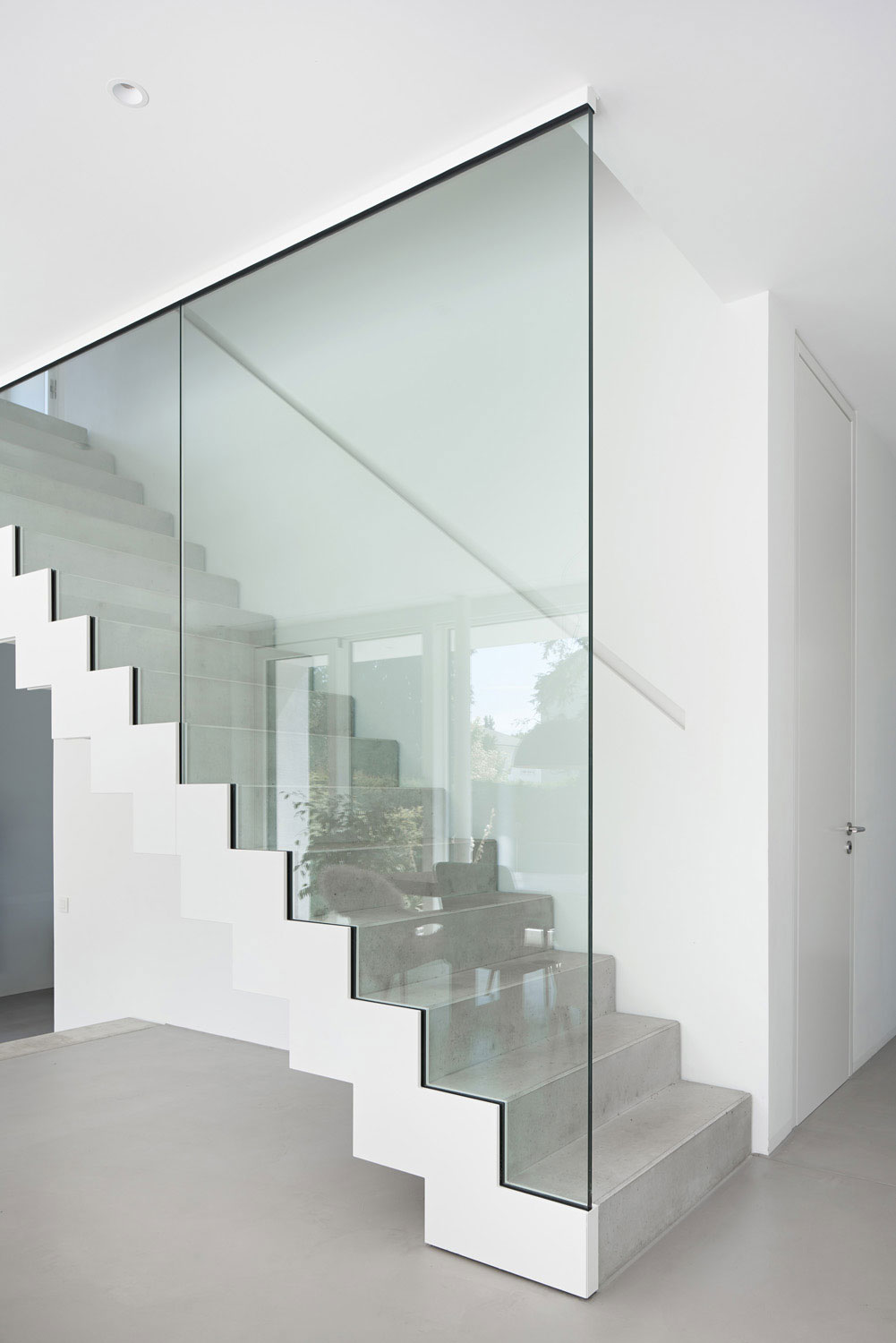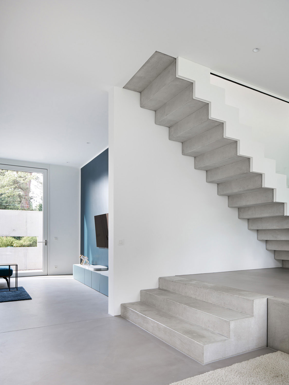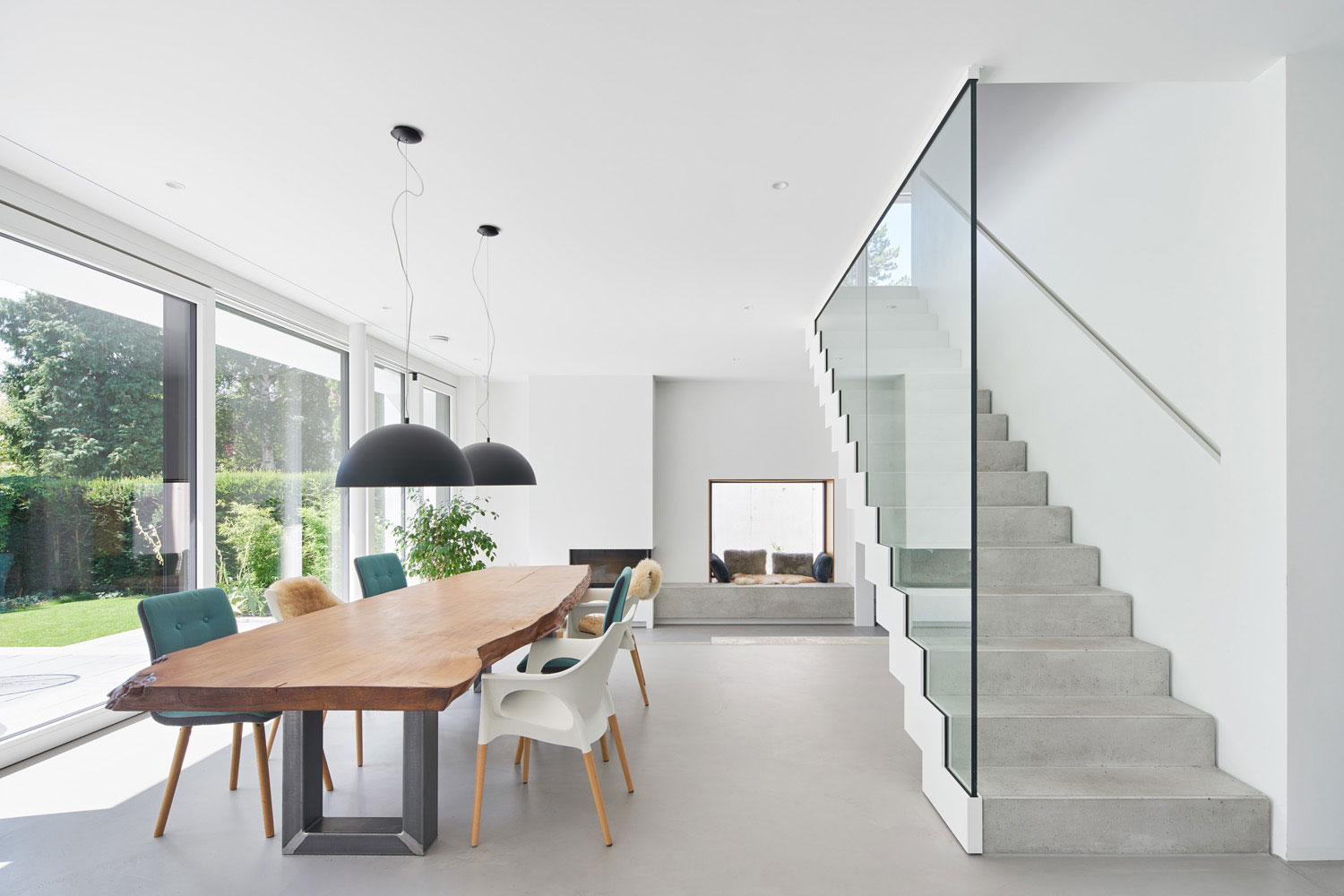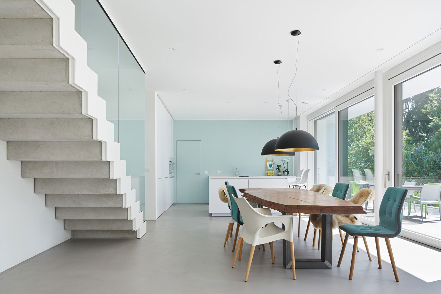 Die zum Essplatz offene Zick-Zack-Sichtbetontreppe wirkt skulptural und harmoniert mit dem durchgängigen Sichtestrich-Bodenbelag.