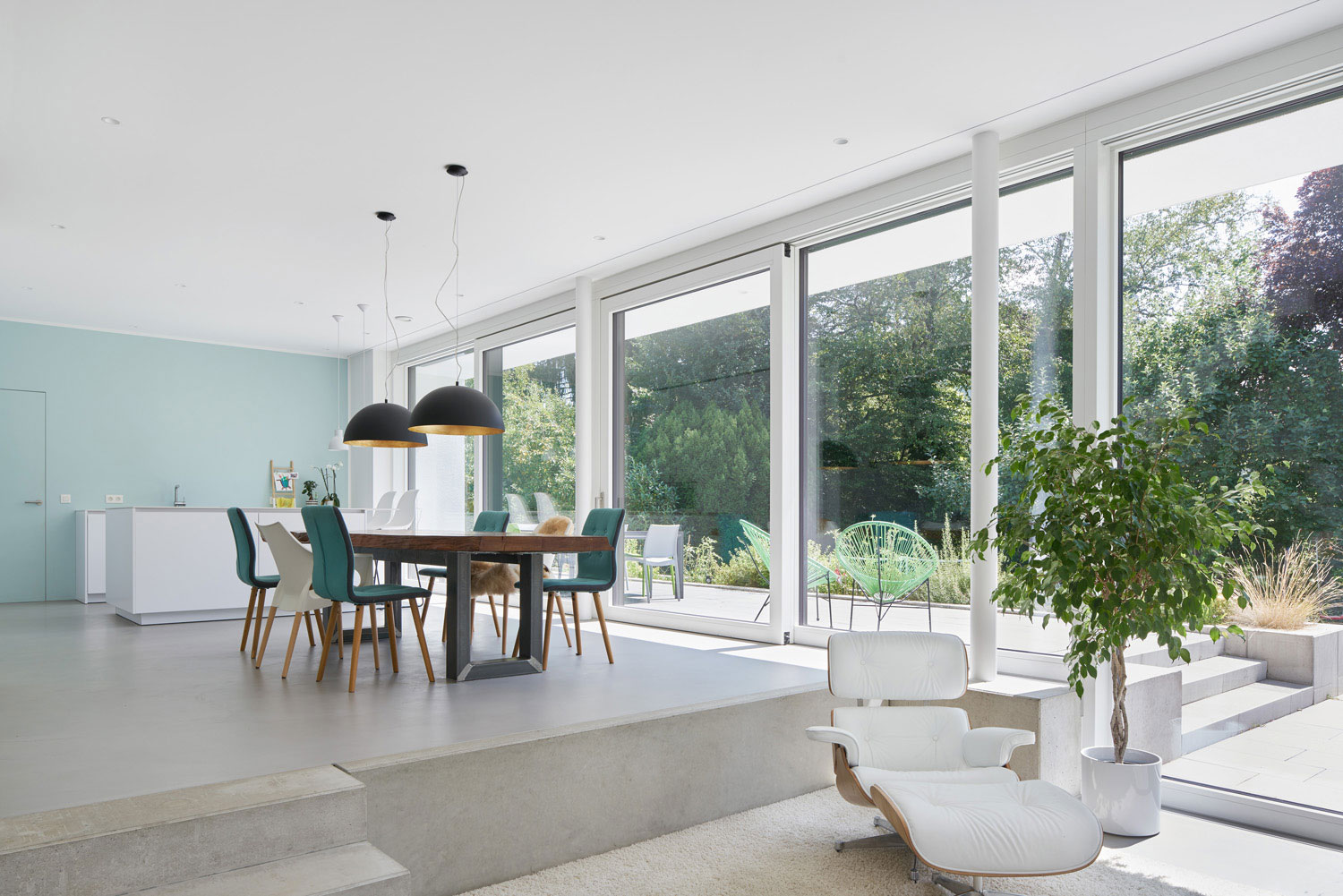 Im Erdgeschoss erschließt man das Gebäude zentral und kommt direkt zum Mittelpunkt für die Familie, dem Essplatz mit Küche und Kochinsel. Der Garten wird durch die durchlaufende, raumhohe Fensterfront über die breite Terrasse hinweg erlebbar gemacht.
