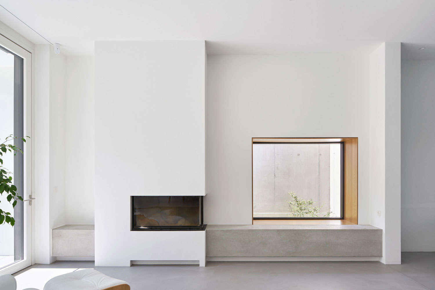 Der Wohnbereich ist durch drei Stufen abgesenkt und strahlt durch über 3,20 m lichte Raumhöhe Weite, Großzügigkeit, trotz optimierter Grundfläche aus. Er ist in zwei Bereiche gegliedert, den Loungebereich mit offenem Kamin und Sitzfenster und dem Medienraum für Film und Musik. Eine zusätzliche Raumattraktion liefert der durch eine Sichtbetonwand blickgeschützte Patio im Außenbereich.