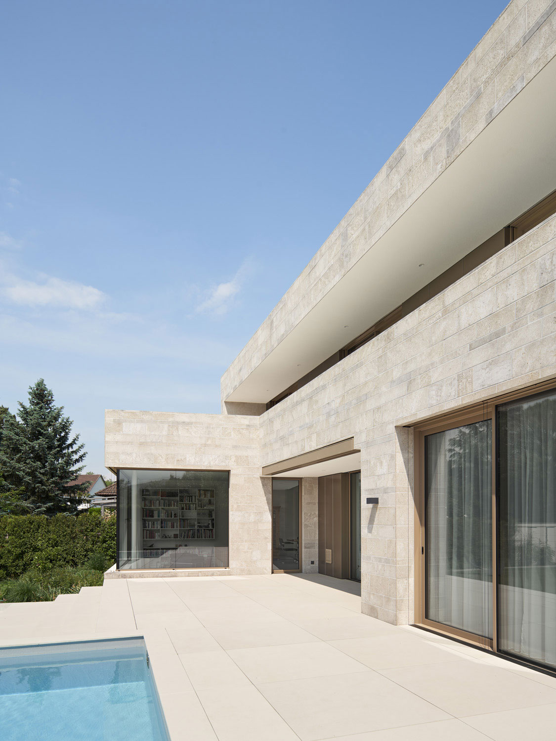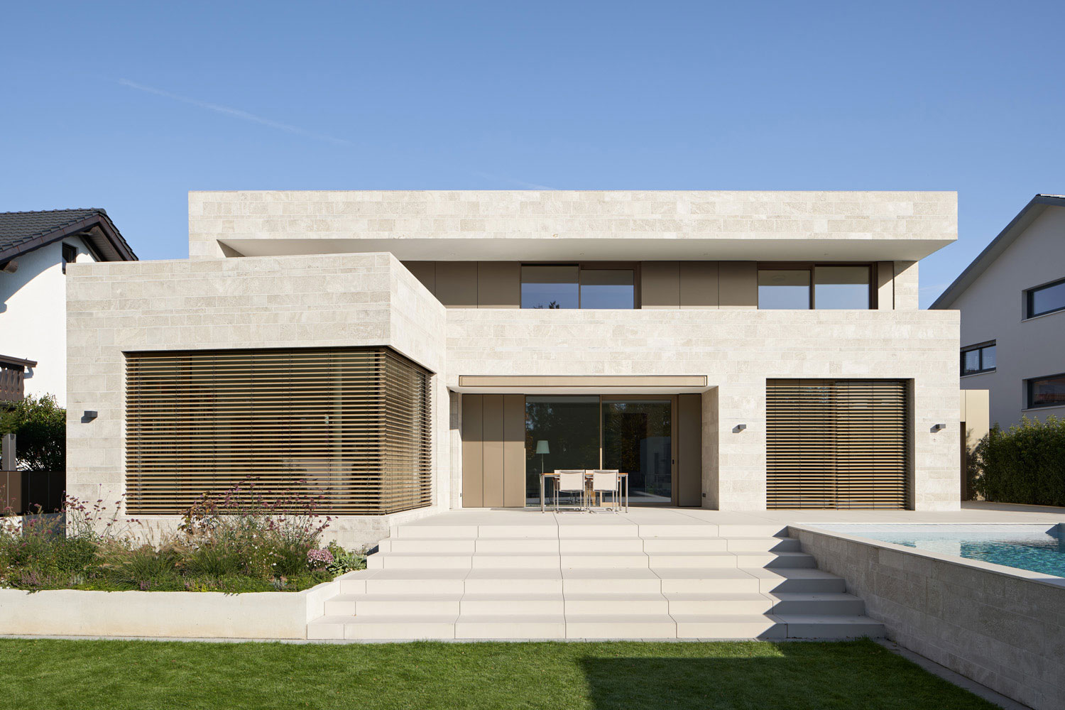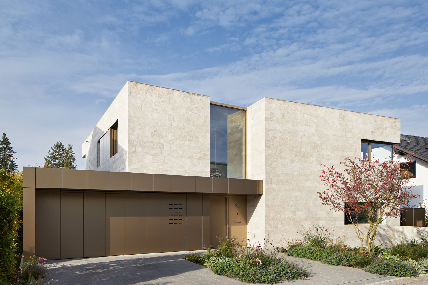 Das Haus besticht durch die konsequente Haltung zu Form, Materialität und Detail. Der kantige Körper verzichtet auf sichtbare, konstruktive Details, wirkt deshalb pur, schnörkellos, klar. Er strahlt Ruhe durch die Baukörpergliederung und Setzung der Öffnungen aber gleichzeitig Spannung aus. Die wartungsfreie, zeitlose Natursteinfassade ist Ausdruck dauerhafter Eleganz, die eloxierte Aluminiumfassade verschneidet sich mit dem Steinkörper, erhöht die Präzision des Ensembles.