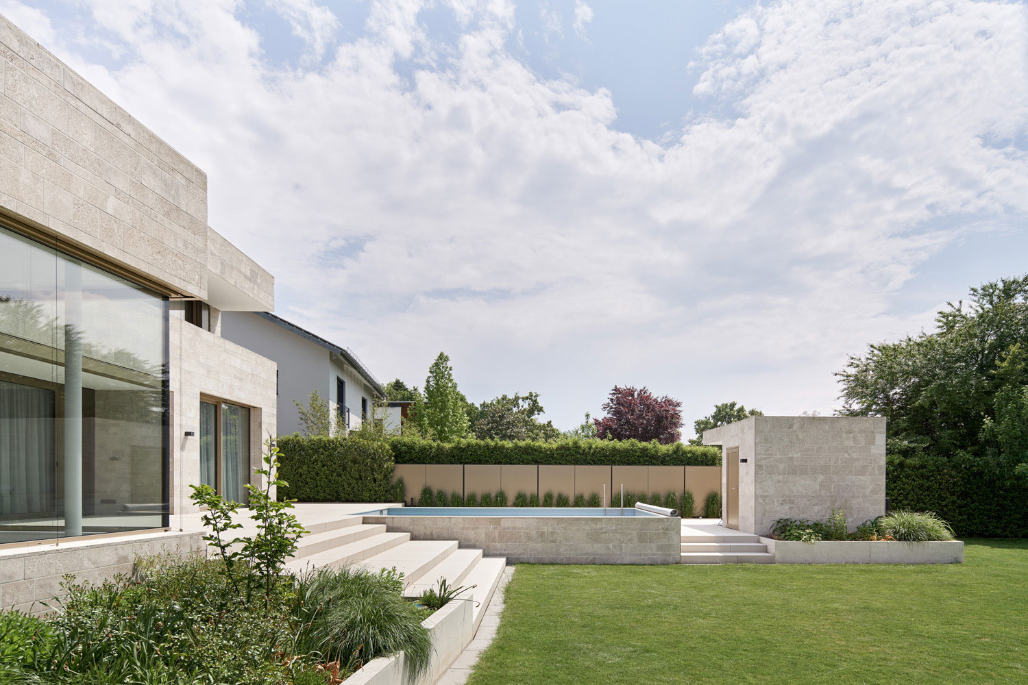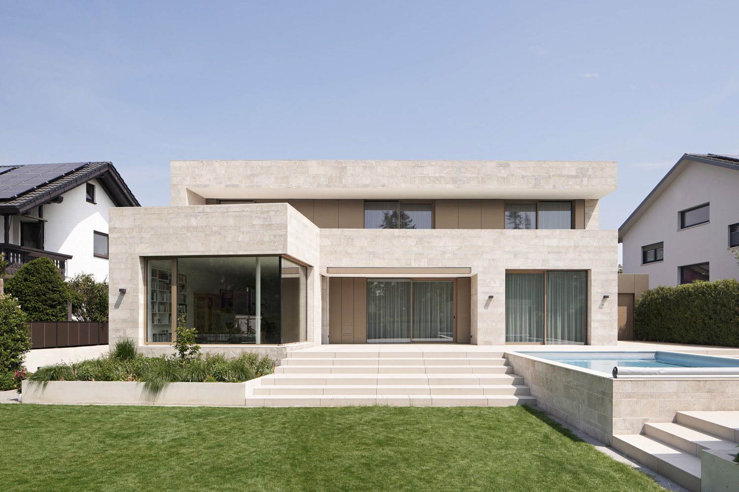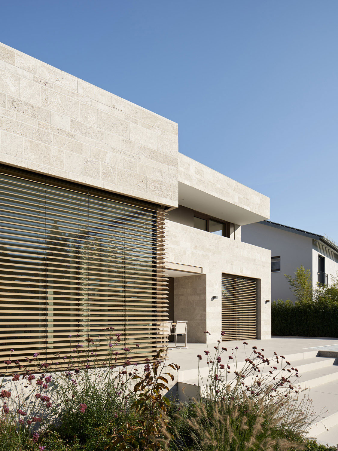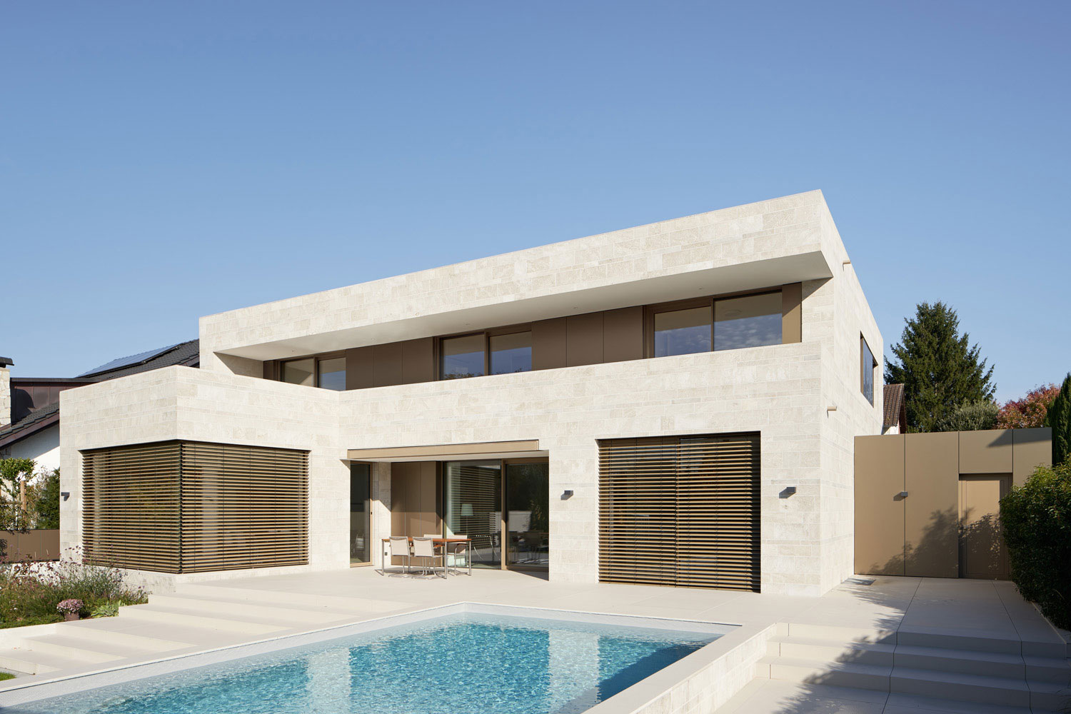 Das Haus besticht durch die konsequente Haltung zu Form, Materialität und Detail. Der kantige Körper verzichtet auf sichtbare, konstruktive Details, wirkt deshalb pur, schnörkellos, klar. Er strahlt Ruhe durch die Baukörpergliederung und Setzung der Öffnungen aber gleichzeitig Spannung aus. Die wartungsfreie, zeitlose Natursteinfassade ist Ausdruck dauerhafter Eleganz, die eloxierte Aluminiumfassade verschneidet sich mit dem Steinkörper, erhöht die Präzision des Ensembles.