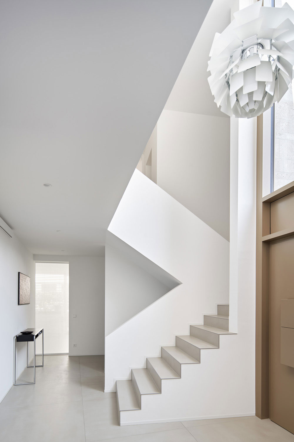 Über den in der Fuge gelegenen, zweigeschossigen Eingangsbereich betritt man das Haus, wird großzügig empfangen, die Orientierung fällt leicht. Eine skulpturale Treppe führt auf die Galerie von der aus die Privaträume der Familie erschlossen werden, denen eine blickgeschützte Loggia-Terrasse vorgelagert ist.