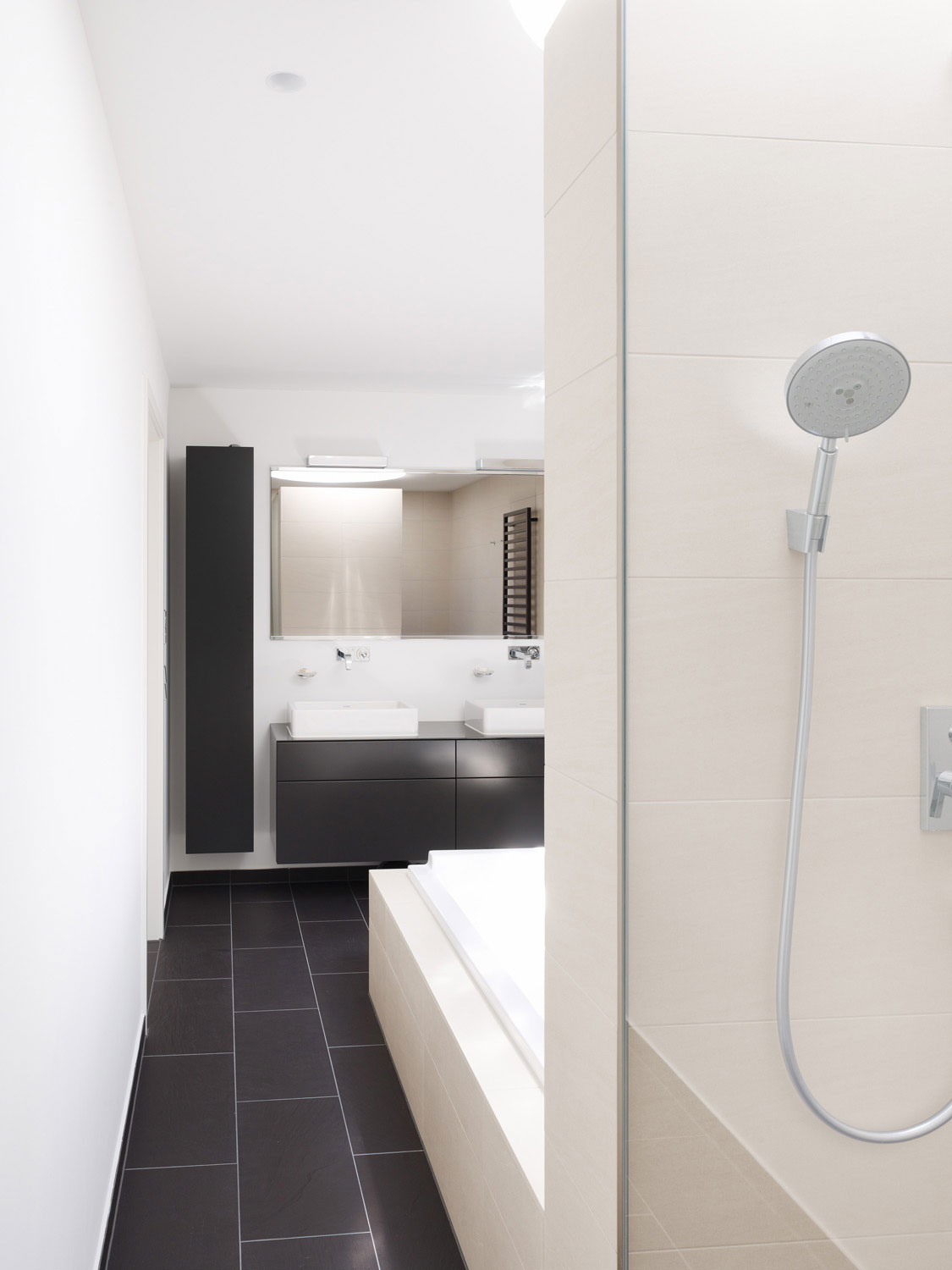 Die vorhandene Einliegerwohnung im Untergeschoss hatte nicht die für Aufenthaltsräume erforderliche Raumhöhe, sollte aber als solche erhalten bleiben. Folglich mussten wir die komplette Bodenplatte rückbauen, die Kellerwände unterfangen und eine neue Bodenplatte einbringen. Dies erlaubte den fachgerechten Einbau von Abdichtungs- und Dämmschichten gegen Erdreich, was zuvor nicht vorhanden war.